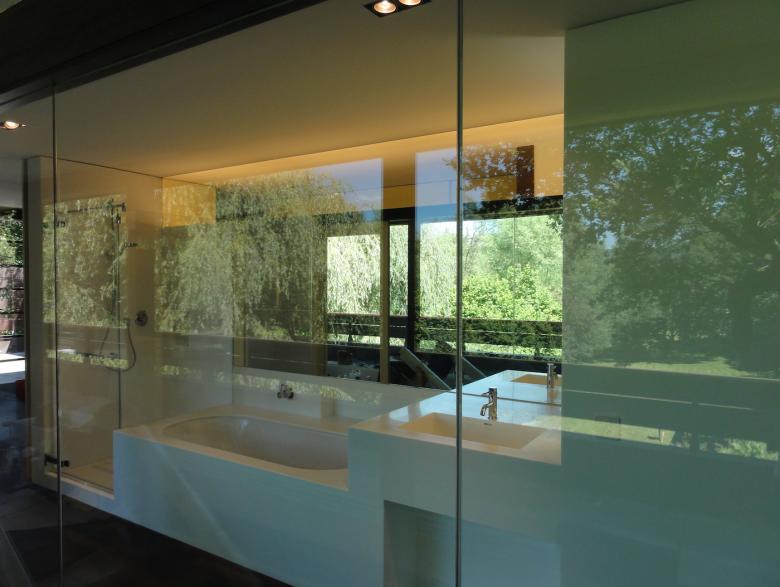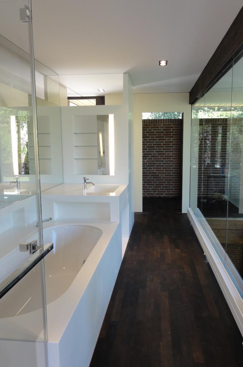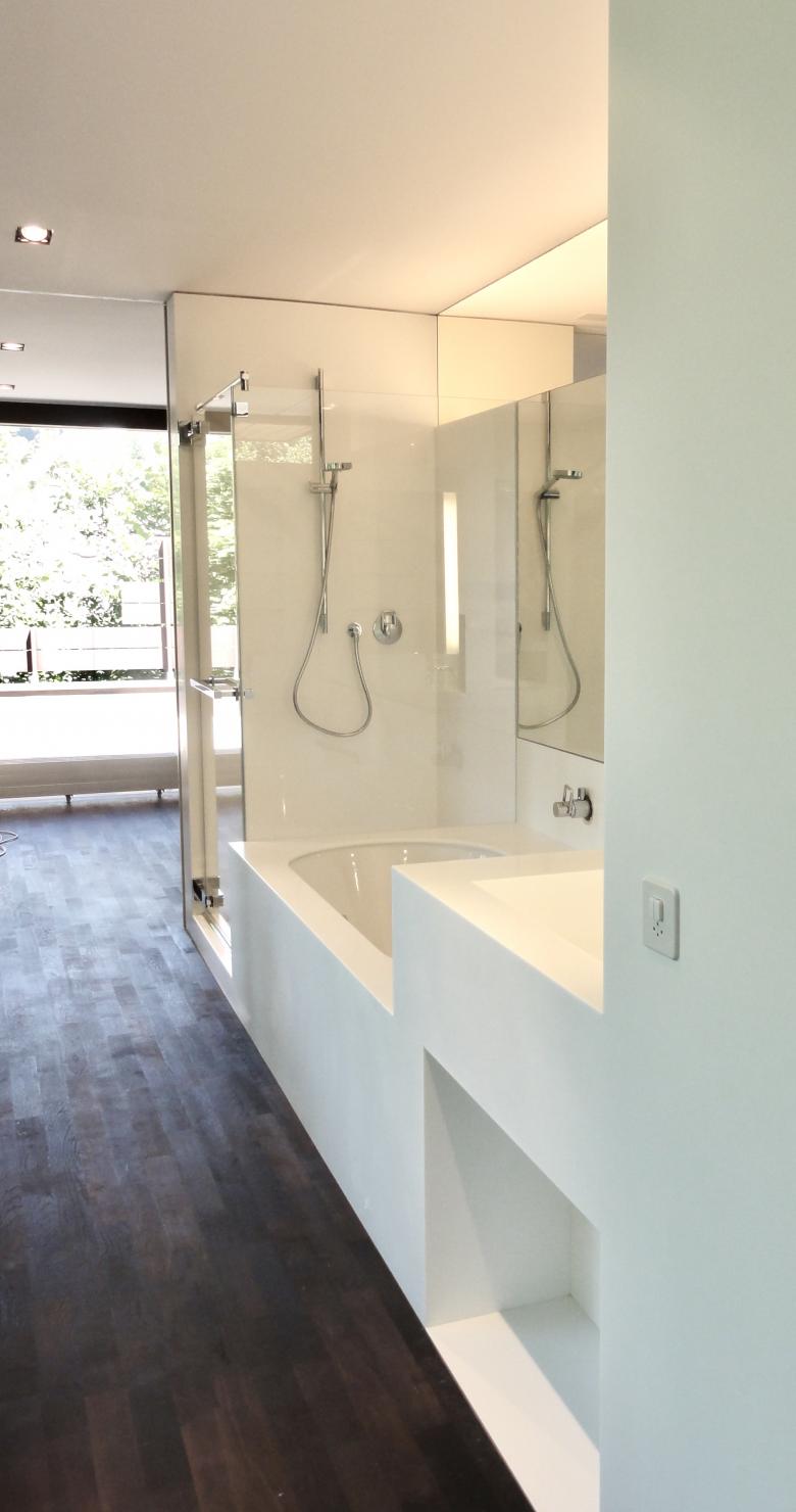 Die Bauherrschaft wünschte den Umbau des Obergeschosses zu einem Elterntrakt mit Schlafzimmer, Ankleide, Bad und Arbeitsnische. Durch die Platzierung des neuen Badeinbaus an zentraler Lage konnte mit wenigen Schiebetüren und Trennwänden diese Raumeinteilung erreicht werden. Hervorzuheben ist die Materialwahl des Badeinbaus, welcher umfassend (Lavabo, Badewanne Dusche, Rück- und Seitenwände) aus einem Guss in Staron, einem porenlosen, gegossenen Massivmaterial, welches überwiegend aus einem hochwertigen Naturmineral besteht, ausgeführt wurde.
