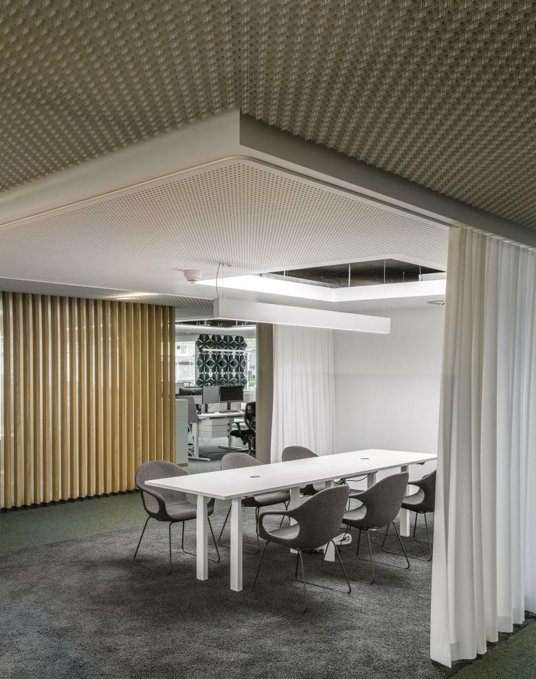 Durch das Spiel mit Enge und Weite, entstehen offenen Raumfolgen mit transparente Übergänge, der einzelnen Abteilungen. Textil-Behänge laden zur räumlicher Veränderung in Wahrnehmung und akustischer Vorteilnahme ein. Tageslicht - in Licht & Schattenwirkungen - erzeugen Abwechslungsreiche Tiefenwirkungen in wechselhafter Erlebbarkeit. Durch diese Dynamik werden die Grundrisse der einzelnen Nutzungseinheiten mit einander spürbar verwoben. … es entsteht ein Raumgefühl des Team orientierten Miteinanders.