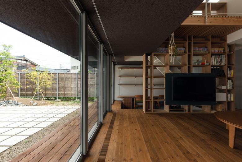 外側には室内の延長として天井高さが低く抑えられたスキップデッキテラスを設えた。