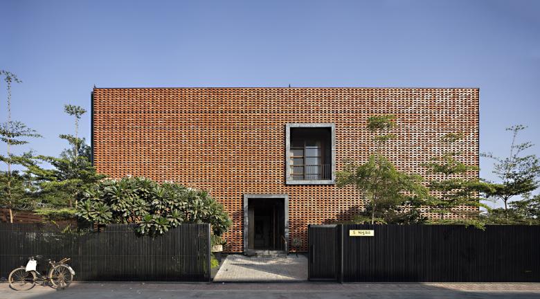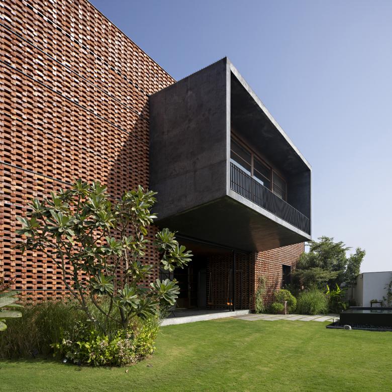 The test was to have each living, sleeping and entertainment space open to the outdoors without privacy loss. The principal big idea was to encircle the otherwise fragmented layout with a clean box like veil of vertical brick jaali.