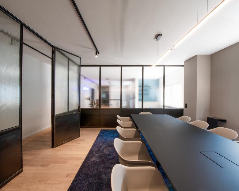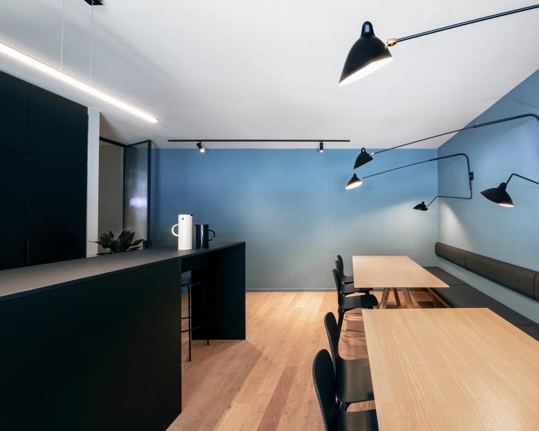 In Zusammenarbeit mit ausgewählten Handwerksbetrieben wurden individuelle Lösungen, wie die drehbaren Akustikelemente oder die Slatwall im Verkaufsbereich, für das Unternehmen entwickelt. Die handgefertigten Stahl-Glastrennwände und Untergestelle der Waschtische im WC verleihen den neuen modernen Räumlichkeiten persönlichen Charme.