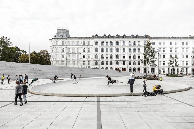 The new Israel's Square consists of a folded surface floating above the ground - like a flying carpet. The square, or surface, hovers between two worlds: the city and the neighboring Ørsted Park. The park wanders into the square as a series of cut-outs on this surface, and folds are placed towards east and west to create sitting areas. Different features and facilities are created on the surface, inviting visitors to stay. For example, niches with bench formations under the tree crowns, a lowered green playground area close to N. Zahle's School, areas for ball games and play and a trickling waterfall.