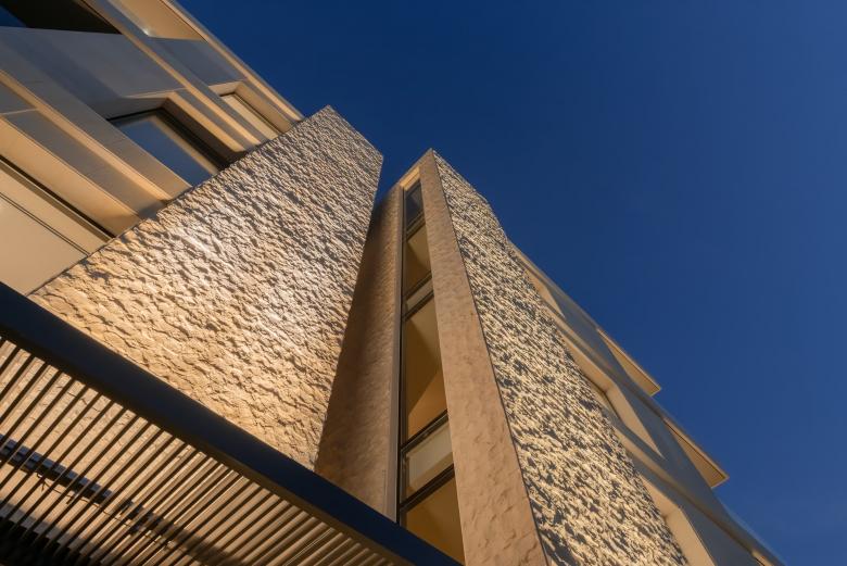 The building is composed of three key elements: a cubic envelope clad in bush-hammered white Maani stone, horizontal floor plate extrusions that reveal the layered program, and a vertical circulation core finished in split-face Maani stone. Using two finishes of the same material creates a subtle tectonic dialogue as light and shadow shift across the façade.