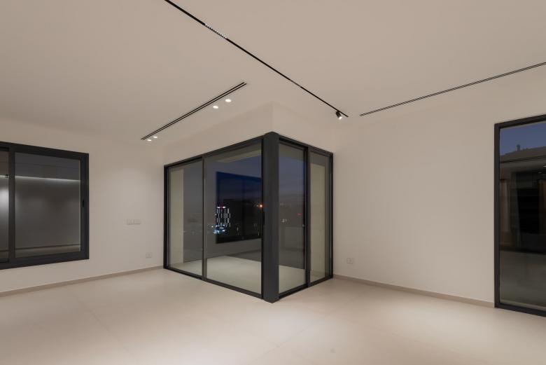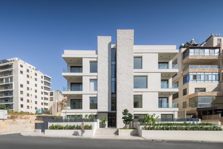 Interior materials—stone, wood, and plaster—create a refined, tactile atmosphere. Polished Omani marble defines the entrance and stair, while French oak in the elevator cladding and full-height doors adds warmth to shared spaces. A gentle lateral shift in the primary façade subtly elongates the building’s visual reading while maintaining the discipline of the structural grid.