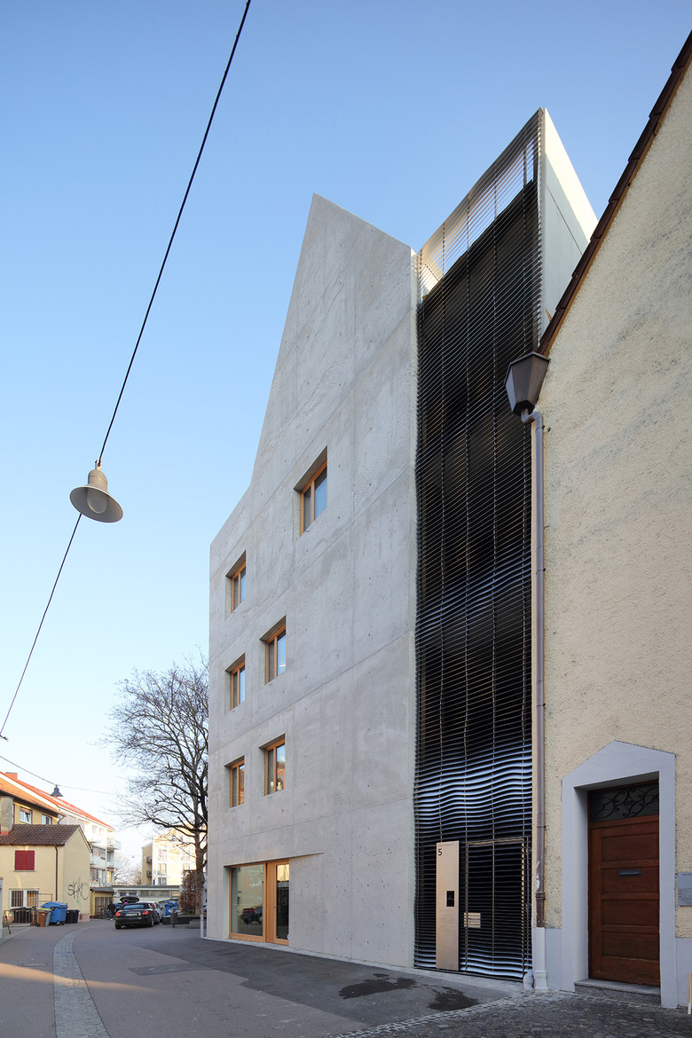 die karpfengasse in ulm ist ein von rückseiten geprägter ort in direkter nachbarschaft zum historisch bedeutenden judenhof – dem „wohnzimmer“ der stadt. das ca. 100 qm große eckgrundstück war früher bebaut, wurde aber seit dem bombenangriff im dezember 1944 nur als parkplatz genutzt. aus gründen der stadtreparatur hat die stadt ulm ein bewerbungsverfahren für die bebauung ausgelobt. hochstrasser.architekten haben dieses verfahren für sich entscheiden.