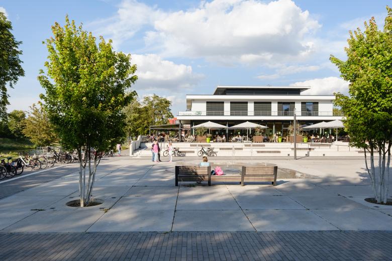 Der Übergang vom Park zum neuen Stadtquartier mündet in einem offenen Platz mit flankierenden Neupflanzungen. Die großzügige Freifläche und der fortlaufende Plattenbelag umschließen das neue Wassersportzentrum mit Außenterrasse für die Gastronomie. Punktuelle Ausstattungselemente und ein Fontänenfeld ermöglichen eine multifunktionale Nutzung des Platzes. Der Übergang zur Uferkante wird durch eine Treppen-/Rampensituation gelöst und bietet neben einem barrierefreien Zugang ausreichend Aufenthaltsmöglichkeiten mit Blick auf den Datteln-Hamm-Kanal. Den Abschluss des gesamten Platzensembles bildet eine Sitzkante am Wasser, welche den Nutzern einen direkten visuellen Wasserkontakt bietet.