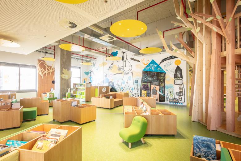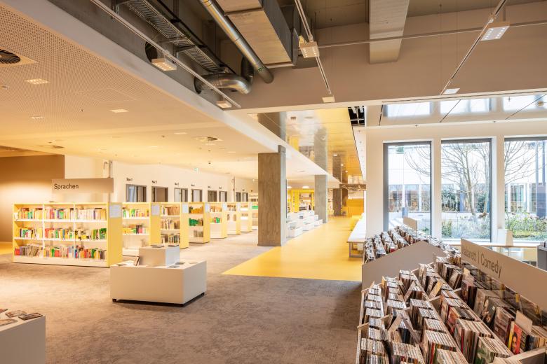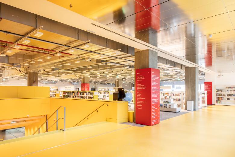Nach der Kernsanierung konnten wir insgesamt 25.000 m² Mietfläche für die verschiedensten Nutzungen bereitstellen. Gerade als Spiel- und Probenstätte für das FFT Juta und FFT Kammerspiele erwiesen sich die hohen Räume als Glücksfall, ideal für einen Theatersaal mit bis zu 285 Sitzplätzen sowie zwei Probebühnen. Auch die rund die Hälfte der Flächen belegende Zentralbibliothek im 2. und 3. Obergeschoss profitiert von den räumlichen Dimensionen, die eine besonders großzügige, offene Besucherfläche und einladende Bedingungen auch für die Kinder- und Jugendbibliothek ermöglichen. Das gesamte 4. Obergeschoss wird nun vom Schulverwaltungsamt der Landeshauptstadt Düsseldorf genutzt. Erschlossen werden alle öffentlich zugänglichen Nutzungsbereiche über ein gebäudehoch offenes, gläsernes Foyer mit Schnellaufzügen. Ein abschließendes besonderes Highlight im wahrsten Wortsinn sind die auf dem Dach montierten vier goldenen Rahmen, als Kunst am Bau geschaffen von der Künstlerin Barbara Wille. Weithin sichtbar laden sie in den neuen Kultur-Hotspot Düsseldorfs ein – das KAP1.