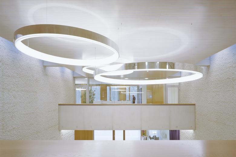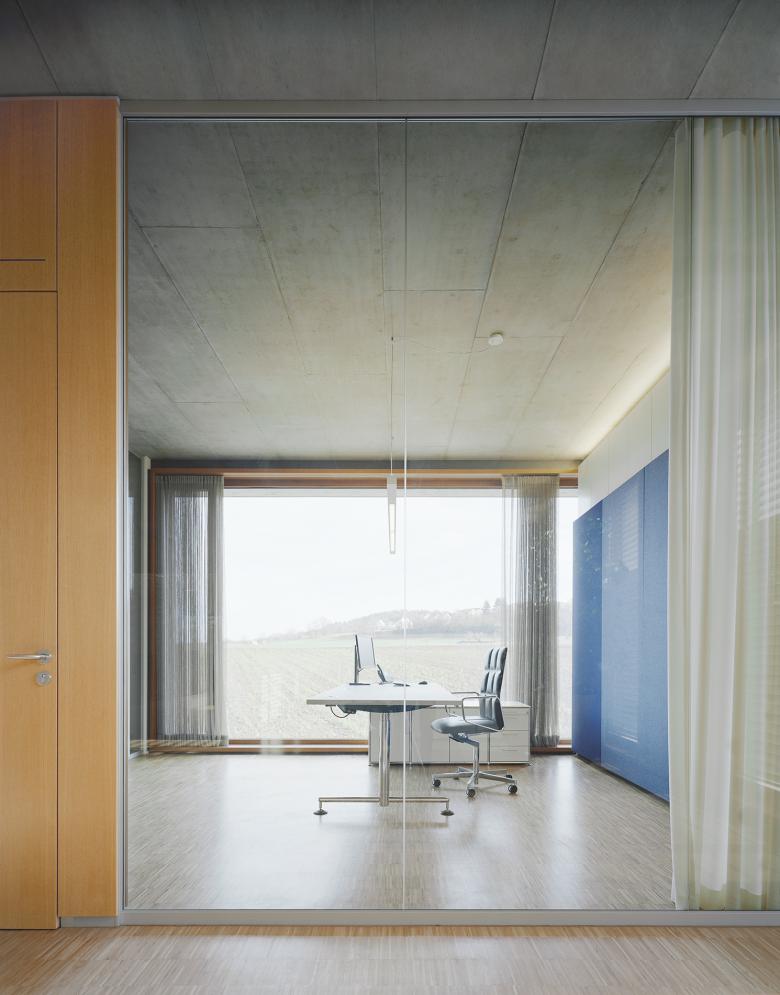 Der pavillonartige Neubau - ein klarer, in sich ruhender, zweigeschossiger Baukörper aus Sichtbeton – orientiert sich mit seiner Höhenentwicklung am Bestandsgebäude und ist mit diesem durch einen verglasten Steg verbunden. Somit sind optimale Büroabläufe und kurze Wege gewährleistet. Eine zentrale, zweigeschossige Halle bildet den Mittelpunkt des Gebäudes. Sie ist Treffpunkt und Veranstaltungsort. Zwei innenliegende Stahlbetonkerne bilden die infrastrukturelle und statische Basis. Sie werden über außenliegende Stahlbetonstützen und -scheiben ergänzt. Dieses Konstruktionsprinzip ermöglicht die komplette Stützenfreiheit des Innenraumes und damit ein Höchstmaß an Flexibilität.
