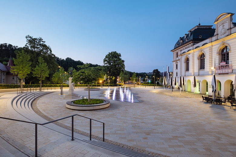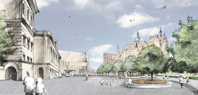 Durch das Verlegen der Fürst-Wilhelm-Straße vor dem historischen Marstall entsteht ein großzügiger Platz mit hoher Aufenthaltsqualität. Fußgängerüberquerungen erleichtern den Überweg über die Fürst-Wilhelm-Straße und damit die Anbindung zur Altstadt im Westen. Die derzeit vorhandene historische Grünanlage vor dem Marstall wird neu interpretiert und behält ihren Bezug zu den Gartenthemen der angrenzenden Parkanlage. Eine permeable Raumkante um die Platzfläche in Form von Kirschbaumpflanzungen entlang der neuen Straßenführung schließt die Grünverbindung zwischen den Freiräumen.
