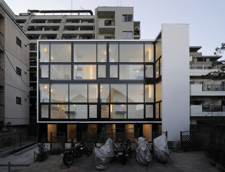 バイクガレージ付き集合住宅。住戸数7。建物前面に広がる住宅地、その向こうに見える新宿の高層ビル群への眺望を活かした構成。1階の天井高を低く抑え、2・3階の居室の天井高を3.4mにした。その高さを活かし、浴室を半階持ち上げている。その床下空間は、アイデア次第でさまざまに利用できる。
