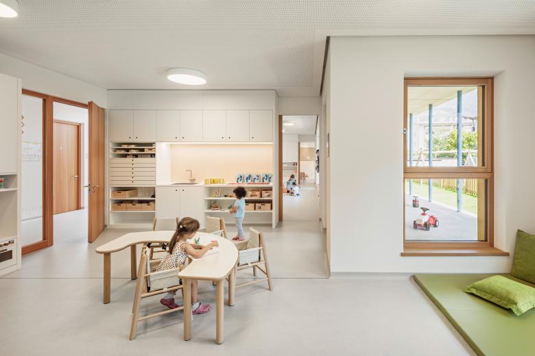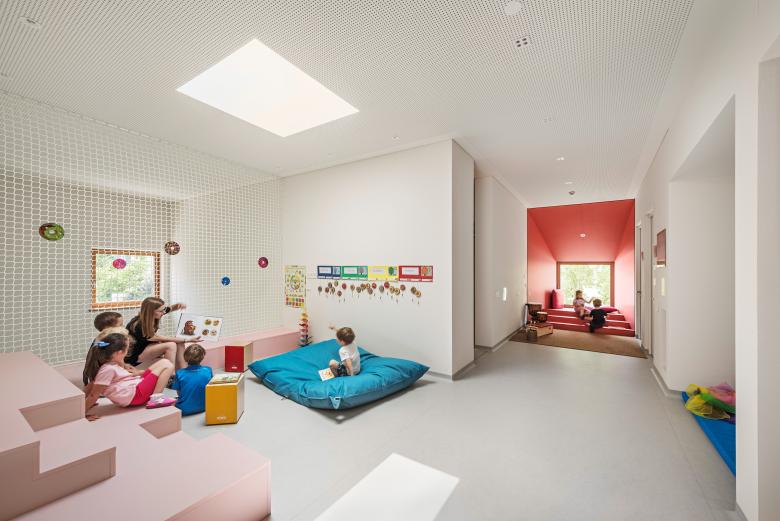 Die Dachterrasse bietet als freie Spielfläche den Kindern Raum, um den Tag im Freien zu verbringen. Das Gebäude selbst durchbricht die Monotonie des langen Grundstücks, indem es in der Höhe auf- und abspringt und so eine vielschichtige Wirkung erzeugt.