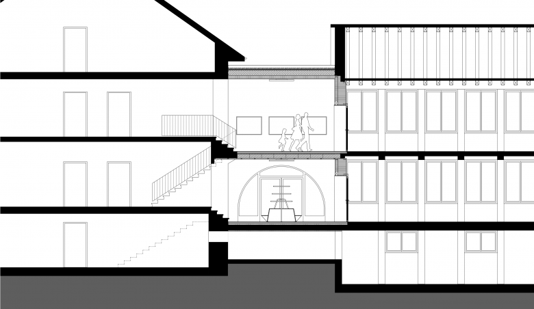 Um die räumlichen Beziehungen erlebbar zu machen, wird das Erdgeschoss weitgehend offen gestaltet. So wird die Verbindung zwischen den beiden Schulbauten und der Durchgang von der Seite des Eingangs zum Garten gewährleistet. Das Obergeschoss wird als Passerelle geschlossener gehalten und gewährt Ausblicke auf die Umgebung. Sämtliche Masse der Möbel sowie die Höhe der Fensteröffnungen sind auf die Grösse der Kinder abgestimmt. Die unkonventionellen Fensteröffnungen sind eine Anlehnung an die (kindliche) Verspieltheit und an die Gabe, die Welt mit magischen Augen zu sehen. Zudem verleihen die Fensteröffnungen dem Verbindungstrakt eine formale Eigenständigkeit. Er soll als neutraler Vermittler zwischen den unterschiedlichen Zeiten stehen, in welchen der historische Kindergarten und die Erweiterung entstanden sind.