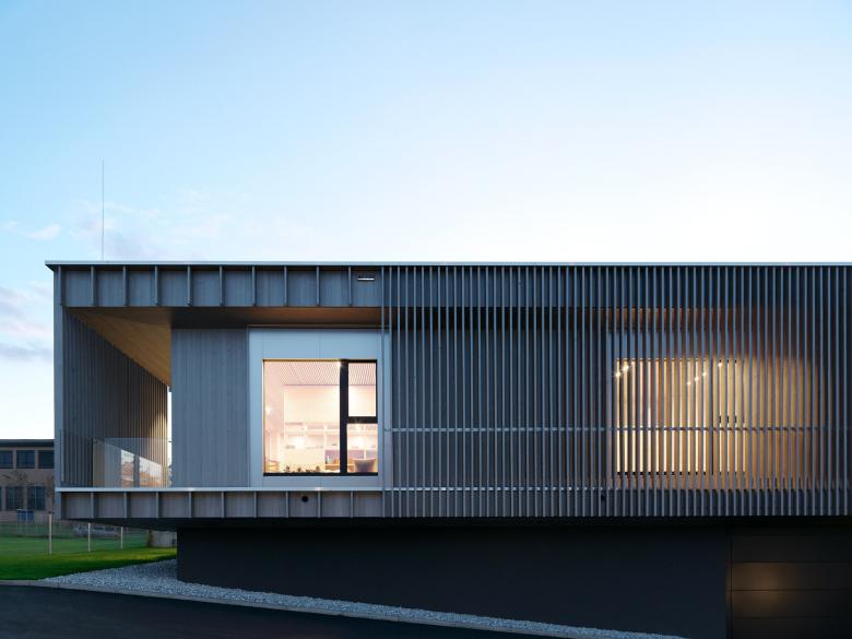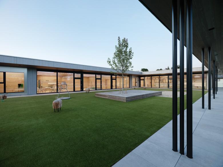 Die Räumlichkeiten des Kindergartens spannen sich L-förmig um den Spielhof auf. Die übersichtlich strukturierten Wegführungen erzeugen Klarheit, platzartige Bereiche alternieren mit privateren Zonen, die den jeweiligen Gruppen zugeordnet sind. Wie eine zweite Haut umhüllt ein silberner Holzfilter die vorgelagerten Terrassenzonen und den Spielhof, der als geschützter Außenbereich den Kindern zur Verfügung steht. Die Fassade strukturiert den Baukörper, funktioniert als Sonnen- und Witterungsschutz und bietet in definierten Bereichen nuancierte Abstufungen zwischen Offenheit und geborgenen Rückzugsmöglichkeiten. Je nach Tageslichteinfall entstehen lebendige, warme Lichtstimmungen. Die fein gegliederte Holzfassade lässt sich auch als »Neststruktur« lesen, die den Kindern Geborgenheit bietet.