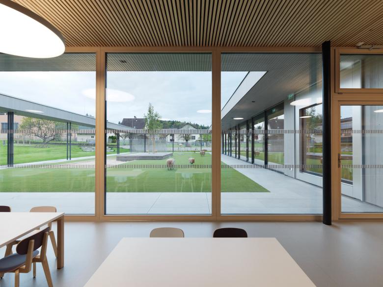 Das Gebäude nimmt den nach Norden abfallenden Hangverlauf auf und fügt sich in das bestehende Gelände ein. Der witterungsgeschützte Eingangsbereich erweitert sich platzartig unter das Gebäude, eine einladende Treppe führt direkt nach oben in die Aufenthaltsbereiche. Über den räumlich gefassten Spielhof, der südseitig ebenerdig vor den Gruppenräumen situiert ist, gelangt man auf eine großzügige Freifläche, die gemeinsam mit den Schülern der angrenzenden Volksschule genutzt wird.