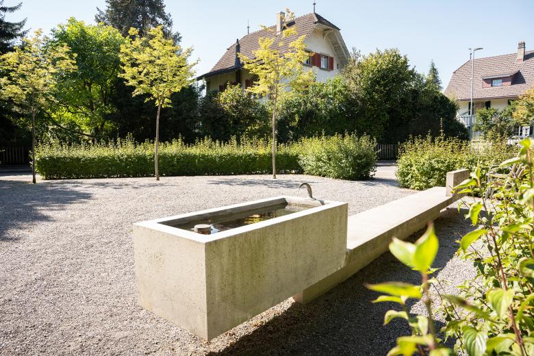 Die Setzung und Geometrie des Neubaus führt zu einer Abfolge hochattraktiver und gut nutzbarer Aussenräume auf der Parzelle. Die Gruppenräume erhalten im Vorland jeweils eine grosszügige und sonnige Spielwiese. Beide Gruppen können so problemlos gleichzeitig Unterricht im Freien abhalten. Auf der Westseite des Gebäudes befinden sich neben dem Haupteingang der Allwetterplatz und ein grosszügiger Spielplatz mit Rasenfläche und Spielgeräten, wo raumgreifendere Spiele möglich sind. Ein Weg aus festem Kies verbindet diese drei Hauptgartenzonen miteinander, wodurch ein für Kinder sehr beliebter Rundlauf möglich wird. Den Kindern stehen ausserdem verschiedene Nischen und Rückzugsmöglichkeiten zur Verfügung. Bestehende Sträucher und Bäume werden mit einem Pflanzgarten, Beeren- und Blütensträuchern sowie rahmenden Hecken ergänzt. Die Garteneinfriedung öffnet und schliesst sich bewusst in bestimmten Abschnitten. Der Anschluss an das Quartier ist von Westen sowie in Nord-Süd Richtig optimal gegeben. An Abenden und Wochenenden stellt der Spielplatz in Zusammenhang mit dem bestehenden Quartierplatz ein attraktives Angebot für Familien des Quartiers dar.