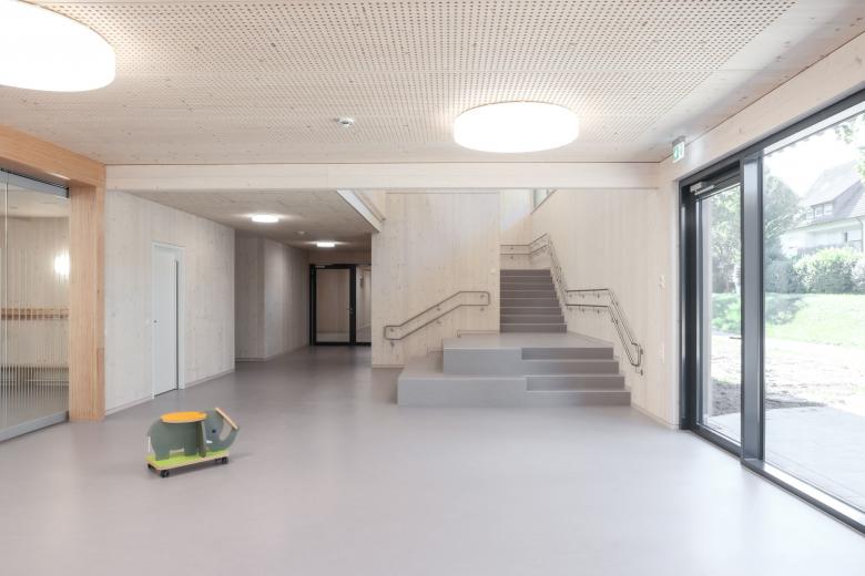 Um die grossflächigen Verglasungen sowie die vorgelagerten Spielzonen optimal zu beschatten, wurden verschiedene Markisentypen eingesetzt – insgesamt 32 exakt auf den Holzbau abgestimmte Anlagen.
