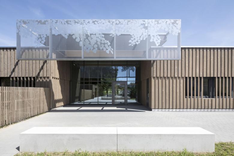 Der eingeschossige Baukörper fügt sich harmonisch in die offene Landschaft am Ortsrand von Walldorf ein. Die jeweils drei Kindergarten- und Kinderkrippengruppen sind in den beiden Flügeln untergebracht, die in der Mitte durch einen gemeinsamen Innenhof, der als Einschnitt ausgebildet ist, verbunden sind. Vom gemeinschaftlichen Foyerbereich, der in die Aula übergeht, können alle weiteren Funktionsbereiche erschlossen werden.