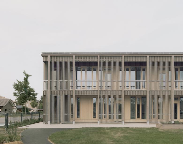 Die mehrschichtige Fassade erweitert die Gruppenräume auch funktional um zusätzliche, geschützte Spiel- und Bewegungszonen an der Nahtstelle zum Garten. Durch die Materialität der Fassade und die konsequent sichtbare Holzkonstruktion des Gebäudes wird dessen Fügung und natürliche Haptik für die Kinder erlebbar.