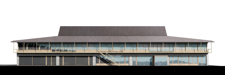 Der neue Kopfbau ist Dreh- und Mittelpunkt nicht nur des Wohngebäudes sondern der ganzen Anlage. Er organisiert die Erschliessung des Wohngebäudes, beherbergt nebst den Dozentenzimmern die zentral gelegenen Gemeinschaftsräume und vermittelt zwischen den beiden Gebäuden, dem Wohnen und der Akademie. Seine Konturen gliedern den zentralen Hof in verschiedene Zonen, in einen Eingangs- und Anlieferungsbereich und einen Werkhofbereich mit der Verbindung in den nördlich gelegenen Garten. Im Erdgeschoss ist das Wohngebäude ganz auf den Hof gerichtet. Nebst dem Zu- gang zum Gebäude und der Tiefgarage sind es die Orangerie wie auch die nordöstlich anschliessenden Werkstätten, welche den gemeinsamen Hof zusätzlich beleben. Die Fassaden wie auch die neuen Lauben sind aus lokalem Holz gefertigt. Die grossen Vordächer schützen die nach aussen öffnen- den Fenster und beziehen sich in ihrer Ausformulierung auf traditionelle Bauten der Region.
