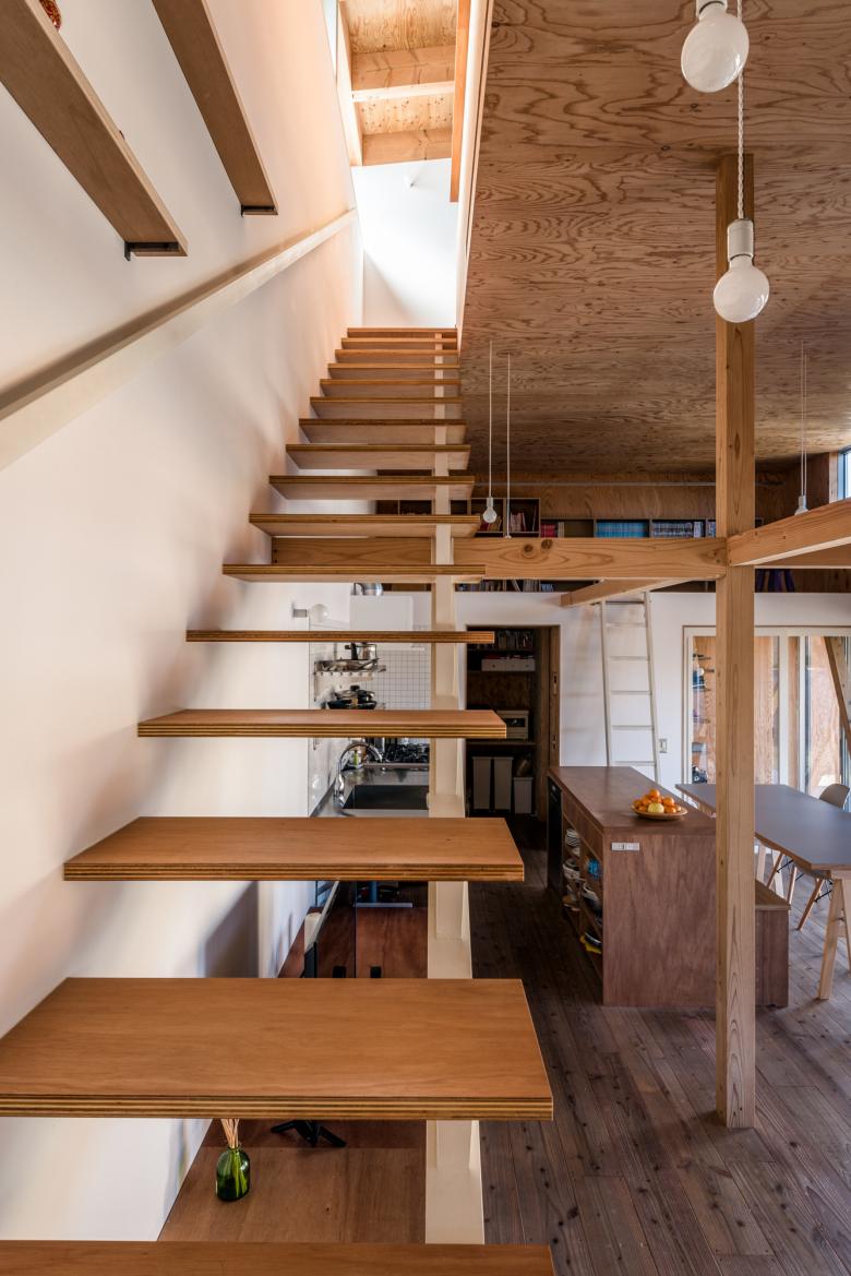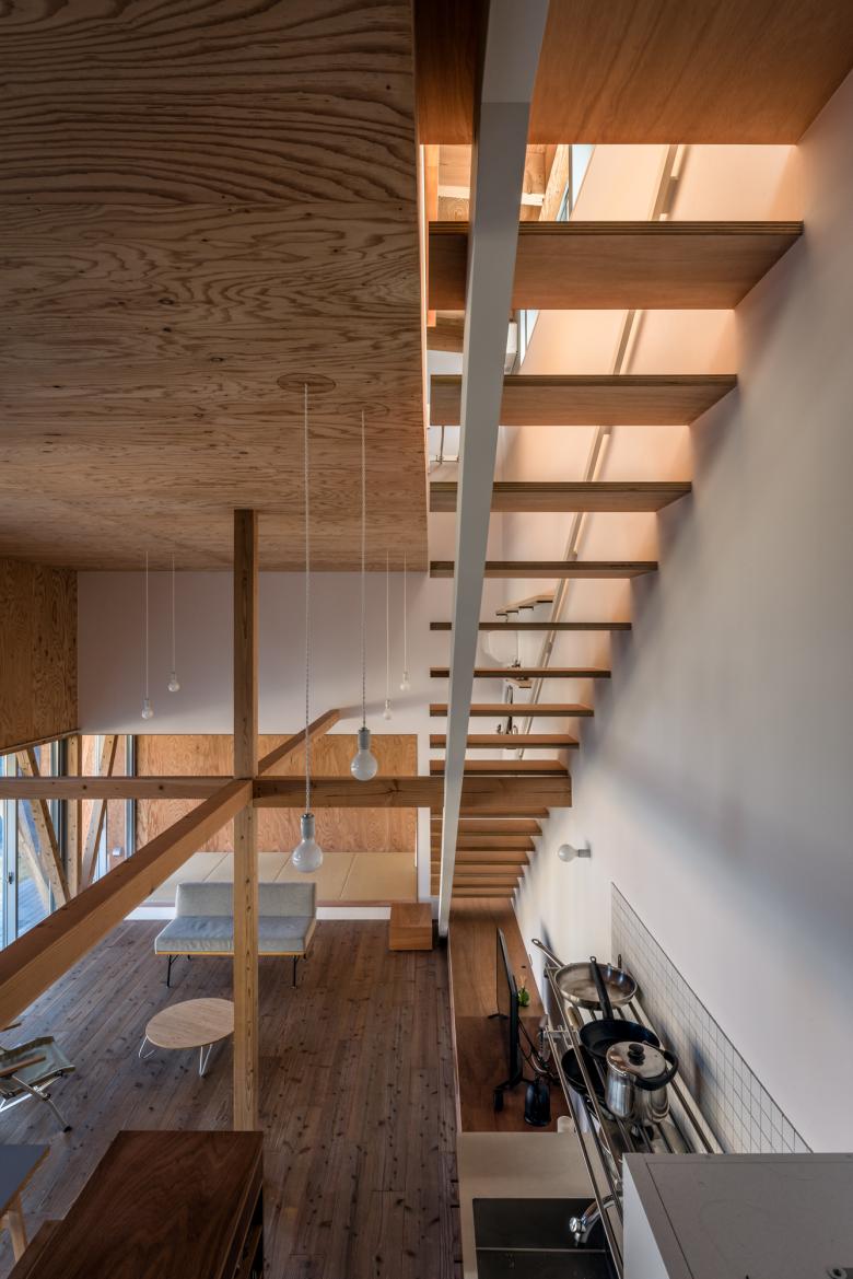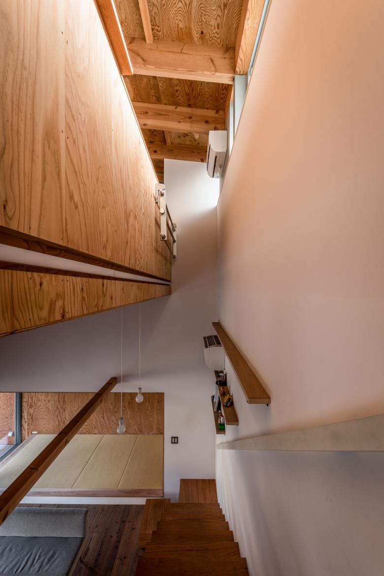 住居棟は木造二階建て、一階の階高を4.0mと高く確保し、それにより出来る大きな気積の中に、中間梁の上部空間をロフトも含む「間の階」として計画した。