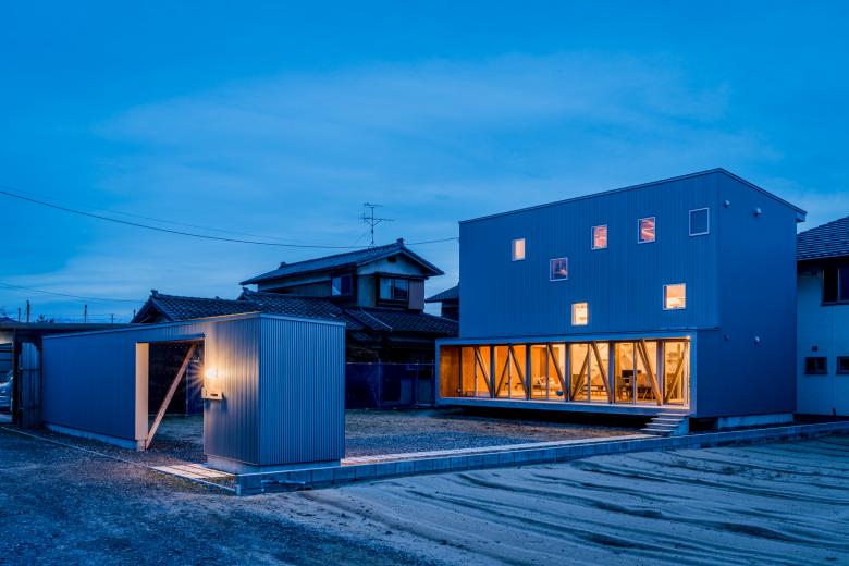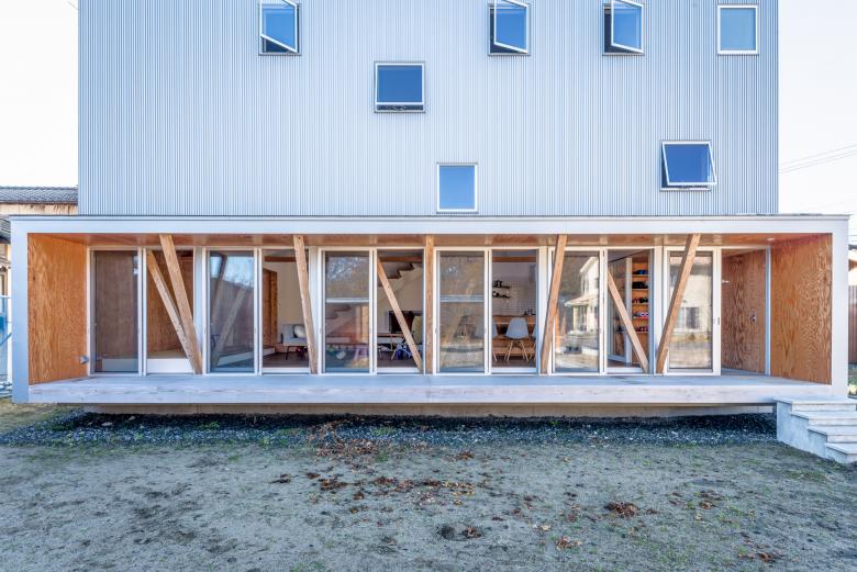 住居棟の屋外との境界には特徴的な筋交いの採用により全面開口と浮遊感のある縁側空間を実現。