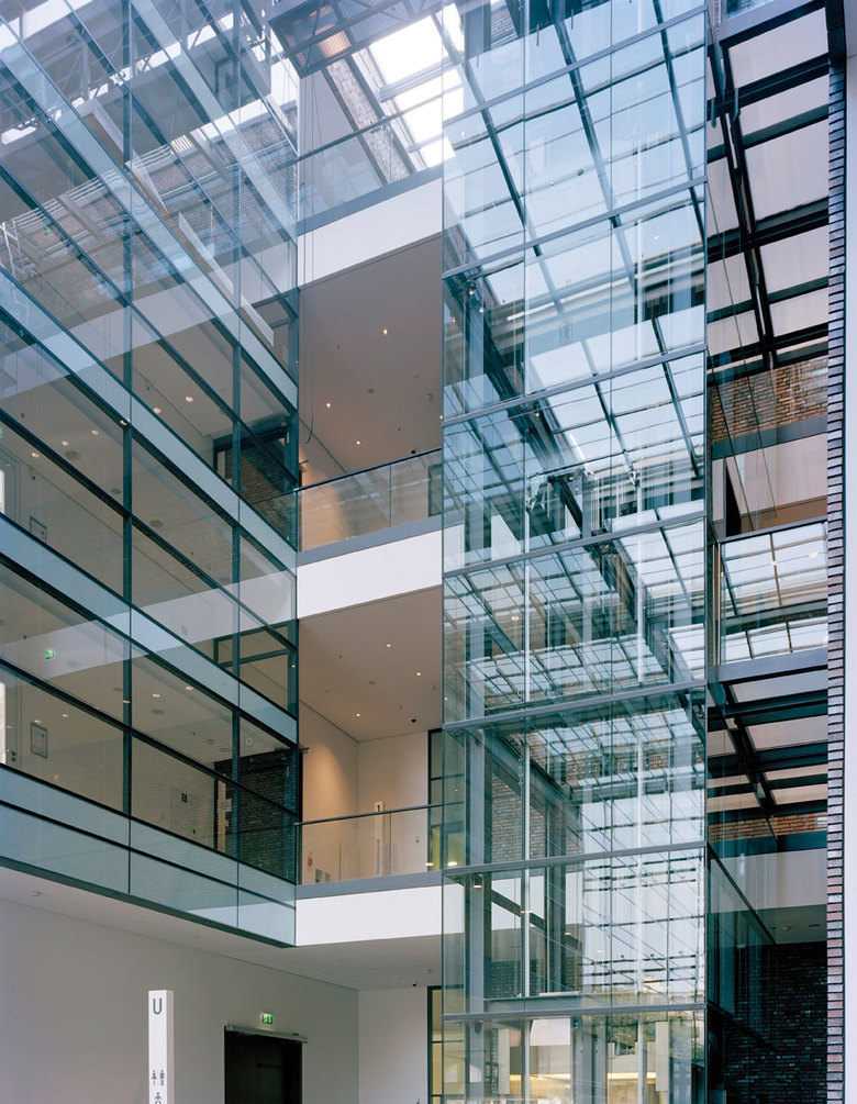 Ausgehend vom Westportal St. Cäciliens spannt sich eine interferente Zone im Foyer des Neubaus auf. Eine transparente lichte Halle bildet das multifunktionale Zentrum des Museumskomplexes.