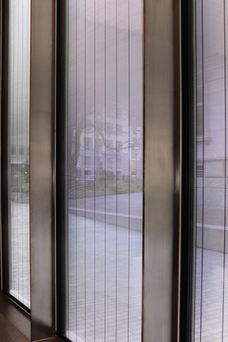 Als Beschattungssystem wurden im Eingangsbereich sechs Edelstahlrolladen s_enn® mit einer Höhe von 5,60 m verbaut, Das Kernstück des Metallbehanges s_enn® – das Behangprofil – wurde gemeinsam mit dem Fraunhofer Institut für Solare Energiesysteme ISE, Freiburg entwickelt. Durch dieses reduziert s_enn® den Energieverbrauch des Gebäudes optimal. Dank einer hohen Transparenz des Behangs bleibt der Sichtkontakt zur Aussenwelt auch bei komplett ausgefahrenem Behang erhalten. Kleine Wickeldurchmesser ermöglichen zudem geringe Einbaumasse. Hohe Windstabilität und zeitlose Optik zeichnen ihn aus.