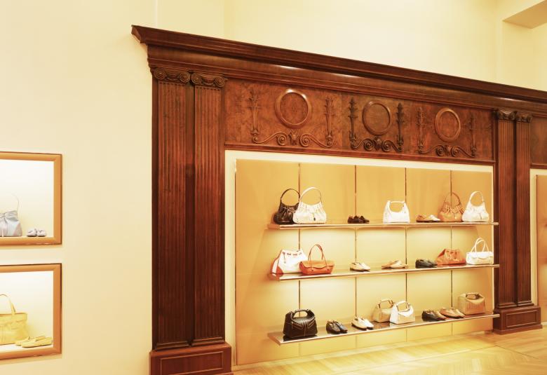 Beim umzubauenden Gebäude an der Bahnhofstrasse handelt es sich um eine geschlossene Blockrandbebauung, deren Innenräume unter Denkmalschutz stehen. Der neue Mieter aus Mailand, der seine exklusiven Schuhe und Handtaschen weltweit in eigenen Boutiquen vertreibt, legte grossen Wert auf das Corporate Design. So mussten edle Materialien wie ein Ahorn Holzboden, Wandverkleidungen aus Gips und Leder sowie Regale und Nischen aus Metall und Leder eingesetzt werden. Im Erdgeschoss befindet sich auf der ganzen Ebene die Verkaufsfläche und im Untergeschoss sind die Nebenräume und Lagerflächen. Das gesamte, neue Lichtkonzept konnte in das Projekt einfliessen. Die drei vorhandenen Messingleuchter aus den 30er Jahren blieben erhalten und wurden in die angepasste Lichtkomposition integriert. Die denkmalgeschützten Holztäfer an den Wänden wurden restauriert, in die neue Gestaltung eingepasst und somit deutlich aufgewertet. Sie bilden einen Kontrast zur neuen Architektur. Die zu erhaltenden Elemente erzeugen zusammen mit den neu gebauten, festen Teilen und der mobilen Ausstattung eine angenehme Stimmung und Atmosphäre.