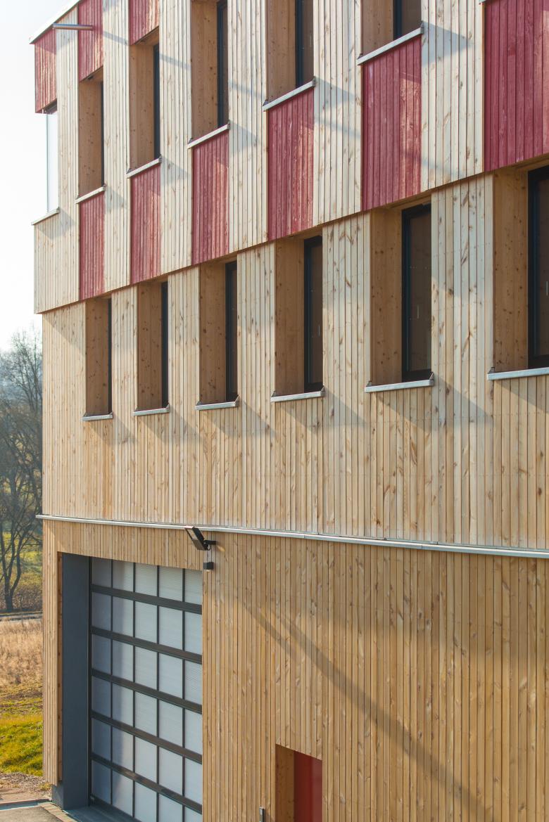 Die gehobelte Holzfassade ist aus unbehandelter heimischer Lärche, nur die zurückgesetzten Flächen an den Fenstern sind mit roter Ölfarbe gestrichen.