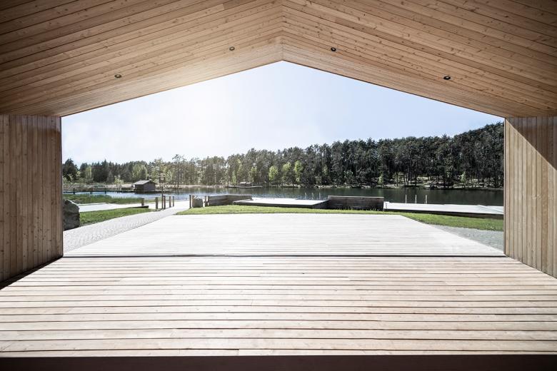 The main building, a new snack-bar with a classic saddle roof, contains a part closed, part open kitchen and counter where food and drinks are served. It expands into an open loggia and terrace, with sweeping views over the lake and newly designed bathing area.