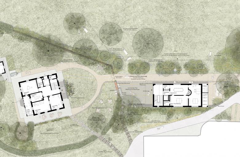 Das ortsbauliche Konzept verstärkt über die präzise Setzung des Ersatzneubaus, die Gestaltung der Ankunftssituation und die Nutzungsverteilung den schützenswerten Wohnstock als ‘Gesicht’ des Gosteli-Archives. Das Freiraumkonzept nimmt diese Lesart des Ortes auf und unterstreicht die Absicht mit differenzierten Interventionen. Die Eingriffe sind zurückhaltend und beruhen weitgehend auf dem Bestand.