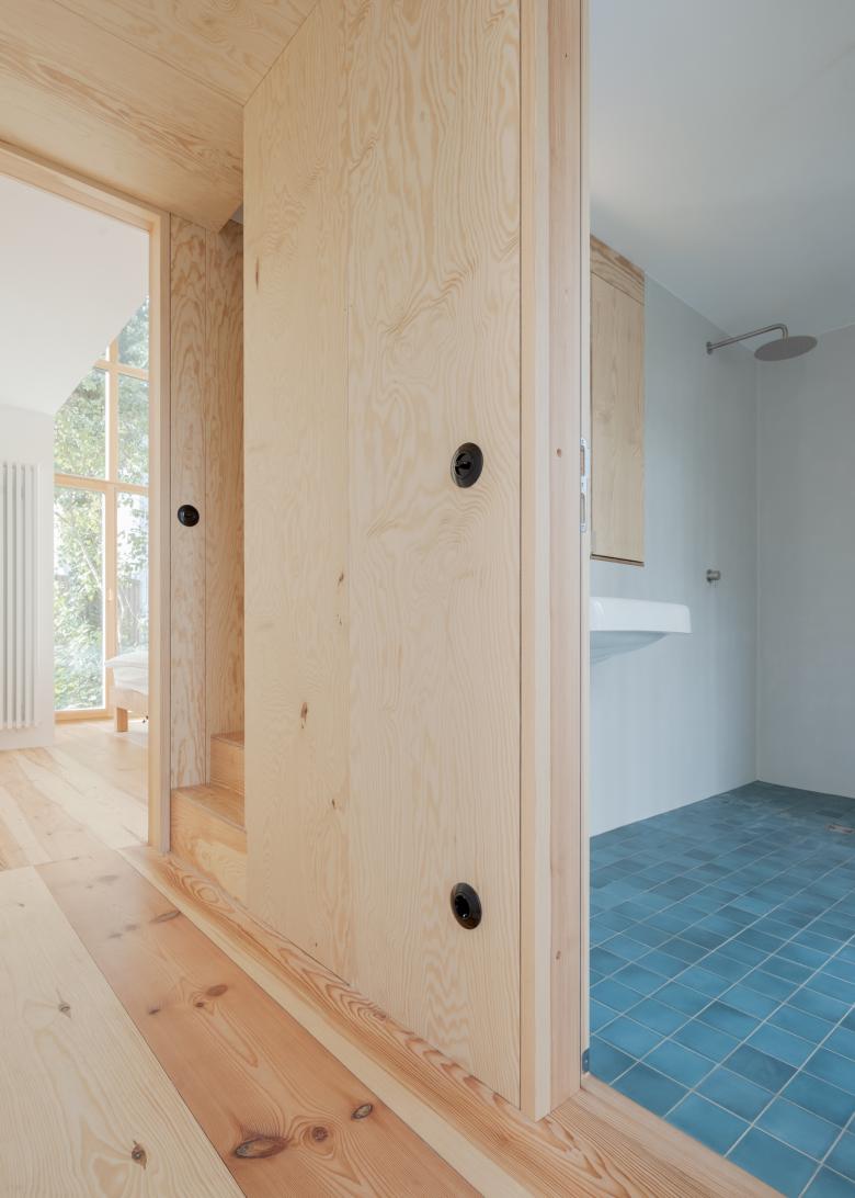 Eine funktionale, minimalistische Ästhetik prägen auch das Innenleben des Hauses. Die hellen Holztöne der Treppe, Schränke und Böden verleihen den Räumen Wärme. Diese Materialwahl trägt zur ruhigen und natürlichen Anmutung des Hauses bei und unterstreicht die Verbindung zur umgebenden Natur. Bemerkenswert sind auch die großen Fensterflächen, die nicht nur viel Tageslicht einlassen, sondern auch den Blick auf die umliegende Landschaft freigeben und die Räume mit der Außenwelt verbinden.