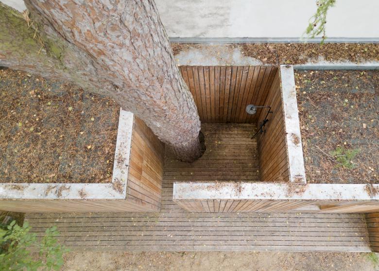 Tritt der Besucher aus dem Wohnzimmer auf die Gartenterrasse hinaus, findet er dort – holzverschalt und nicht gleich ins Auge springend – ein schmuckes Nebengebäude mit Sauna und Außendusche. Die klare Gestaltung mit hellem, unbehandeltem Holz, schafft auch hier eine beruhigende Atmosphäre für Bewohner und Gäste, die sich im geschützten Raum erhitzen oder – neben der mächtigen im Inneren der Außendusche emporwachsenden Kiefer – abkühlen mögen.