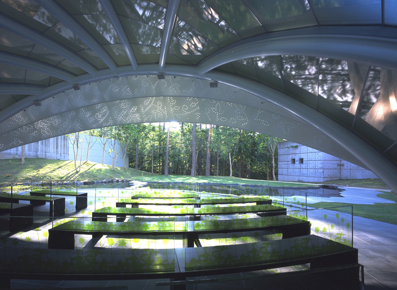 チャペルの形状は2枚の葉っぱをイメージしている。1枚がガラス、1枚がスチール。それらが地上に舞い落ちて柔らかく重なり合った様子を連想させる。繊細なレースパターンの施されたガラス屋根は藤棚がモチーフで、屋根を支えるスチールパイプの曲がり梁は葉っぱの葉脈を思い起こさせる。
