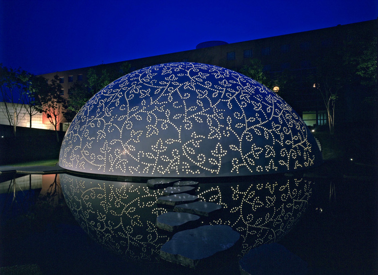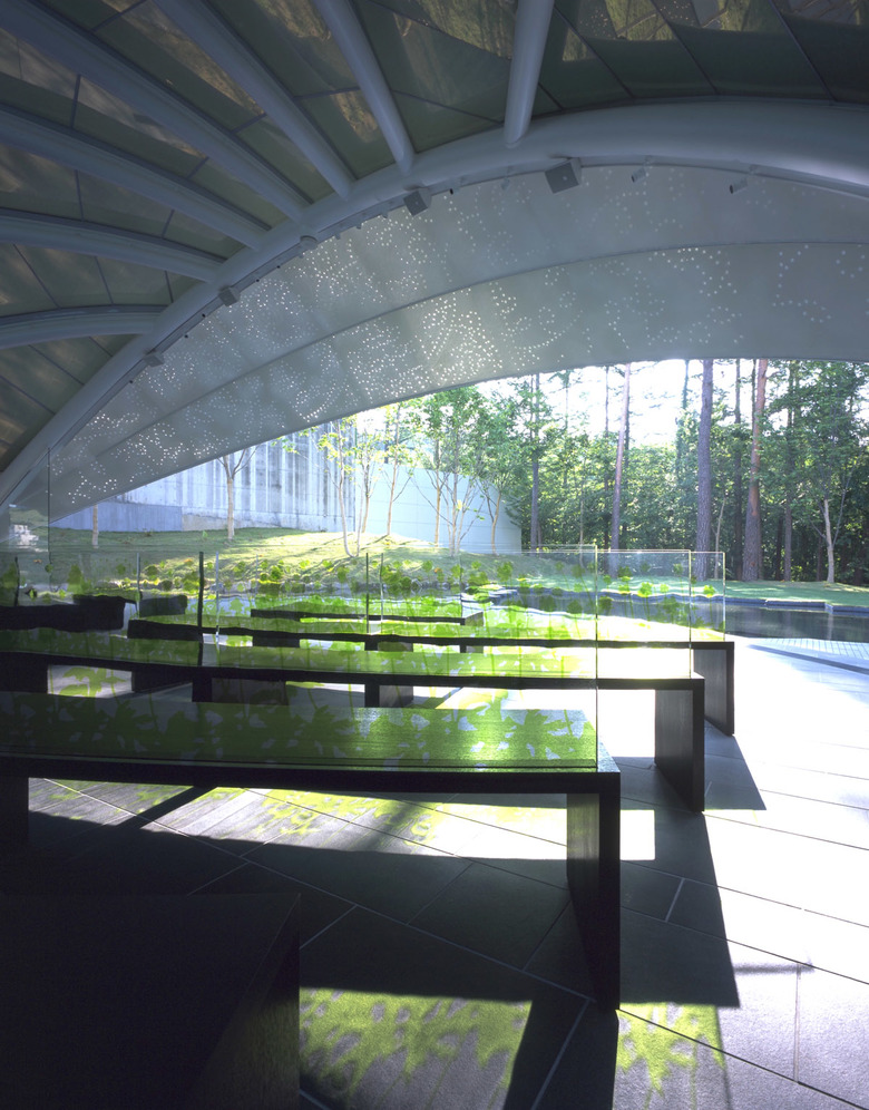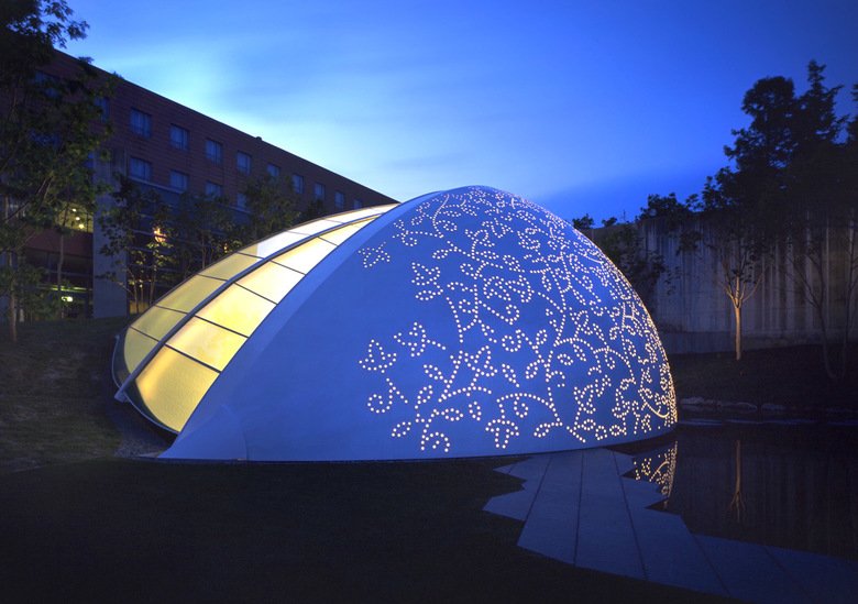 もう一方のポリカーボネートキャッピングされた約4700個の穴を持つ真っ白なスチールの葉っぱは、繊細なレースで出来た新婦の冠るベールのイメージ。穴を通り抜けた光が室内側の白い膜面にも光を落とし、不思議なダブルレイヤーのレースパターンを生む。日中、時間の経過とともに太陽の光もその角度を変え、それに伴ってこの膜面に生み出される無数の異なる光のレースパターンは見る人に驚きと不思議さを与えるバックグラウンドとして挙式に花をそえる。