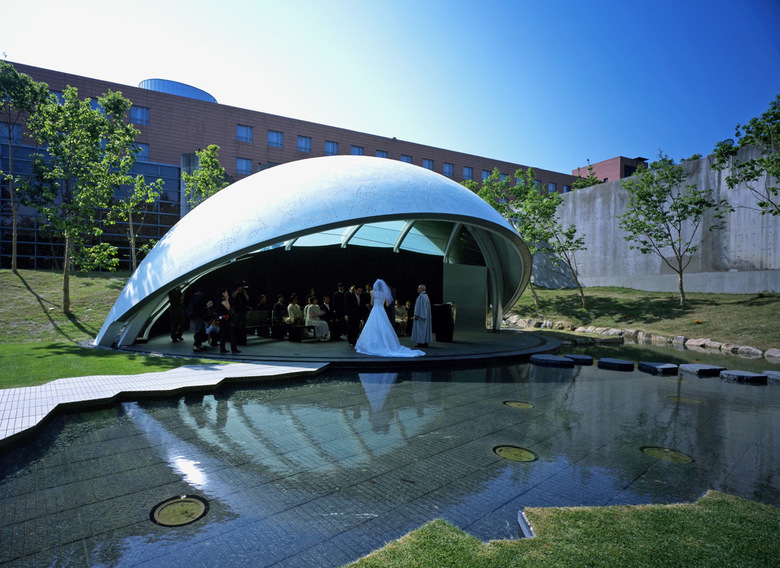 式のクライマックスで新郎が新婦のベールを上げて誓いのキスをする時、まるで魔法をかけたかのようにチャペルもそのスチールのベールが開き上げ、池の水面のゆらめきや木々を抜ける風音といった魅力的な自然が目の前にその姿を現す。実際にはスチールのベールは約11トンもあるのだが、そんな重さを感じさせずにまるで布切れででも出来ているかのように軽やかにそして静かに約40秒かけて持ち上がる。