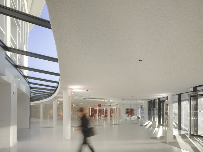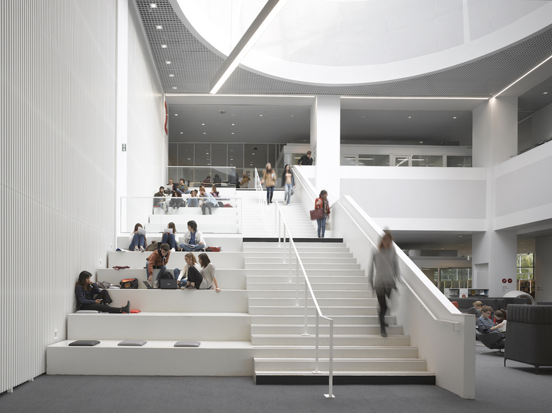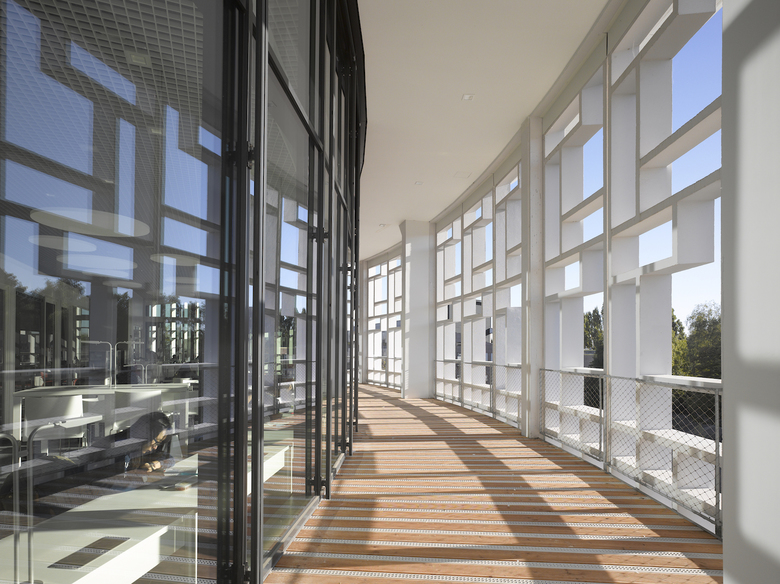 Das bestehende Bibliotheksgebäude mit seiner prägnanten, netzartig aufgelösten Betonfassade wird um einen Veranstaltungsbereich, eine Cafeteria und ein Experimentarium erweitert. Ein landschaftlich gestaltetes Plateau umfasst den Rundbau und setzt sich von diesem durch eine konzentrische Lichtfuge ab. Unter seinem geschwungenen Dach werden der neue Eingangsbereich und die Erweiterungsflächen angeordnet und über eine große, alle Geschosse umfassende Halle mit dem Bestandsgebäude verbunden. Aus der Bibliothek im klassischen Sinn wird ein modernes „Learning Center“.