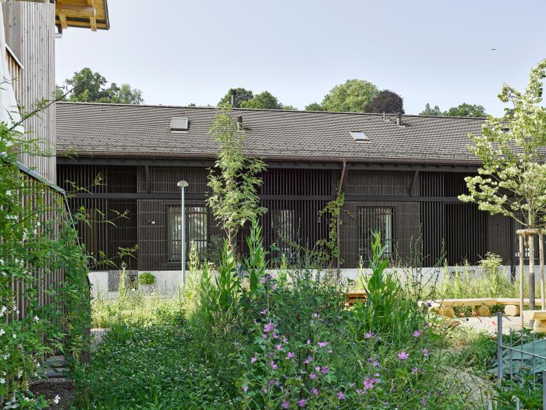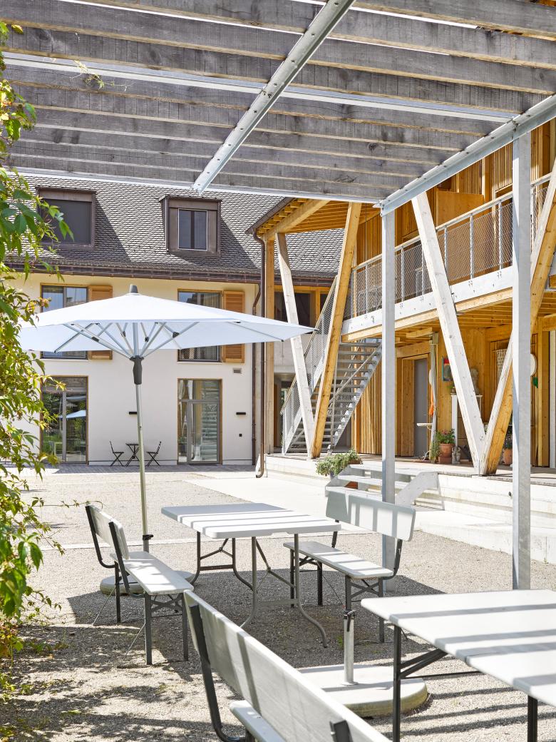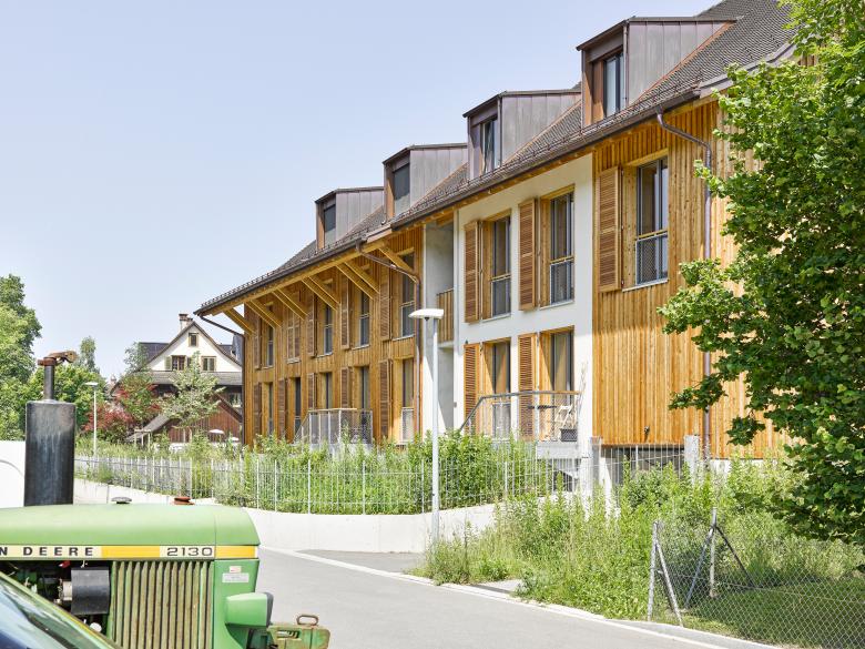 Das Ensemble besteht aus einem Reihenhaus zwischen Strasse und Thur und zwei Häusern mit Etagenwohnungen auf der anderen Strassenseite, die sich – einem Bauernhaus und dem dazugehörigen, rückwärtigen Wirtschaftsgebäude gleich – einen grosszügigen Hof teilen. Von dort aus erfolgt ihre Erschliessung über Laubengänge: pragmatische, offene Orte der Begegnung und subtile Übergänge zum privaten Wohnraum. Durch die unterschiedliche Ausformulierung der Lauben – einmal als lineare Erschliessung mit zwei Treppen und markantem Holzfachwerk und einmal als kompakte, skulpturale Erschliessung in Betonausführung – erhalten die beiden Gebäude als Strassen- und Hofhaus sehr unterschiedlich Charaktere.