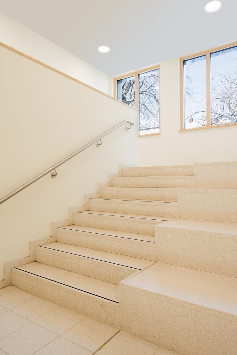 Für die Grundschule Nußbaumerstraße errichten wir einen Neubau in Holzmodulbauweise mit einer Mensa und fünf Räumen für unterschiedliche Nutzungen im offenen Ganztagsbetrieb. Er wurde barrierefrei und klimaschonend in Passivhausbauweise mit Gründach errichtet. Das Gebäude ist zweigeschossig und besitzt eine einfache, klare Geometrie mit zurückhaltenden Fassaden und einem hervorgehobenen Eingangsbereich. Im Erdgeschoss wurden Gemeinschaftsflächen und eine großzügige Mensa geschaffen, während im Obergeschoss zwischen den Klassenräumen Zonen der Begegnung und des informellen Lernens entstehen. Diese unterschiedlichen Arbeits- und Lernatmosphären fördern ein kollaboratives und inspirierendes Umfeld. Ein besonderes Highlight ist der als grünes Klassenzimmer konzipierte Terrassenbereich, der in das Gebäudevolumen eingebettet ist. Hier haben die Schülerinnen und Schüler die Möglichkeit, im Freien zu lernen und die natürliche Umgebung zu genießen. Die Verwendung eines konsequenten Konstruktions- und Ausbaurasters, das der modularen Bauweise zugrunde liegt, schafft Klarheit und Ruhe. Besonders einladend wirkt die verglaste Eingangshalle, die mit einer kombinierten Geh- und Sitztreppe ausgestattet ist. Sie fördert die Kommunikation und schafft Orientierung.