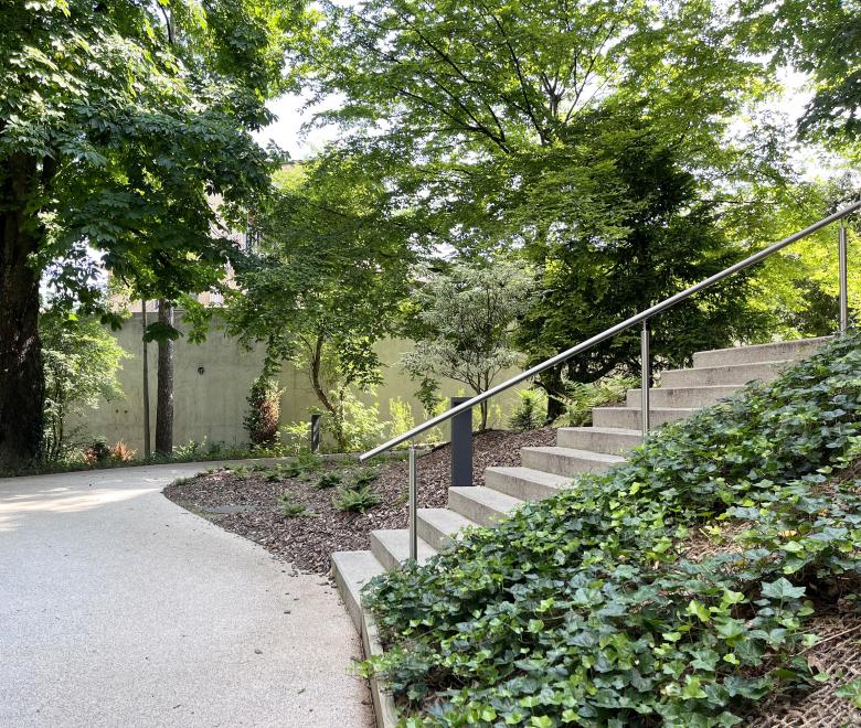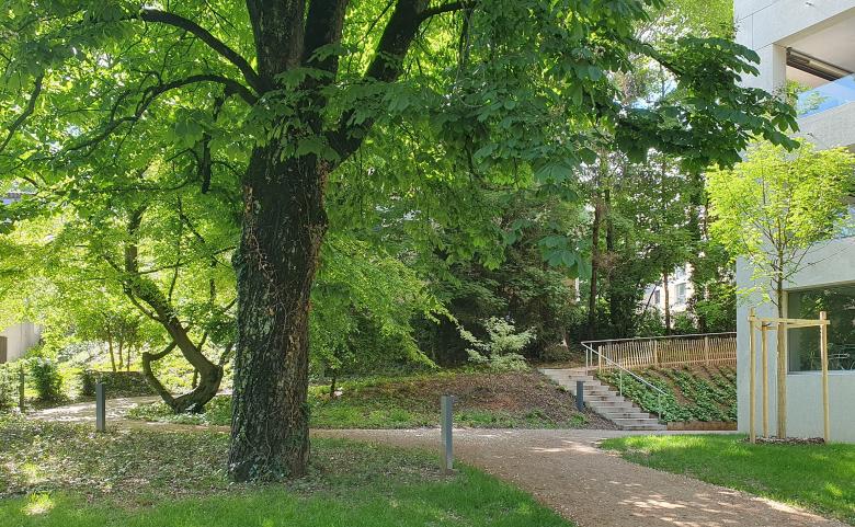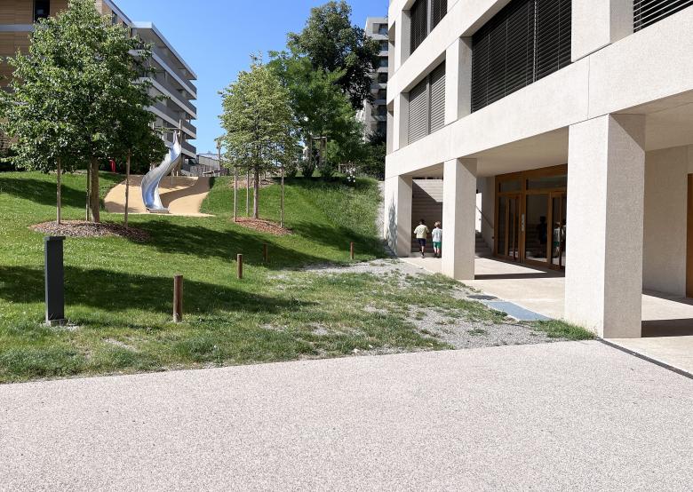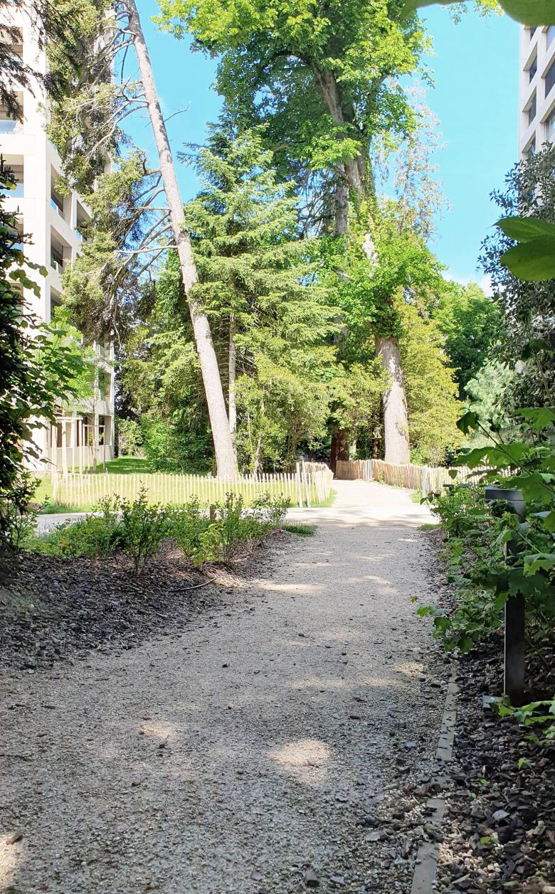 L’aménagement paysager s’est développé à partir des 2 prémisses : un carrefour de liaisons piétonnes inter-quartier et l’importante ceinture arborée existante.