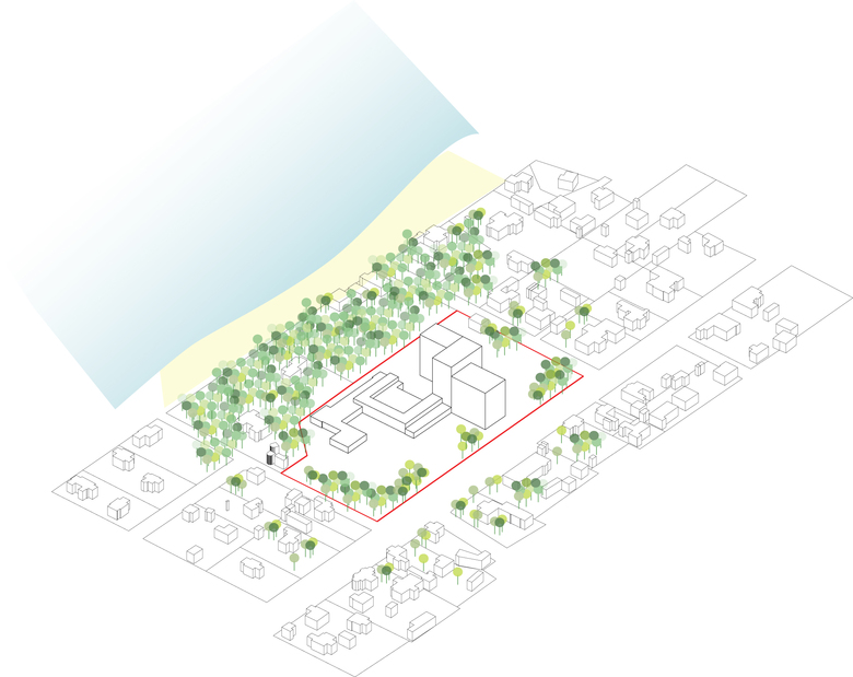 From the outset we do not consider the ground floor, which is the focus of public activity in the hotel, to be a solid block. The key points of attraction identified for the hotel’s public program are distributed outwards throughout the site where they can best appreciate its natural qualities. The result is an outward movement of the hotel that spreads out in shapes designed to penetrate further into the site. At this point the spaces of the hotel are subject to decay. Outward movement becomes a material story of decay as closed and protected rooms clad in wood lose their materiality and gradually turn into glass.