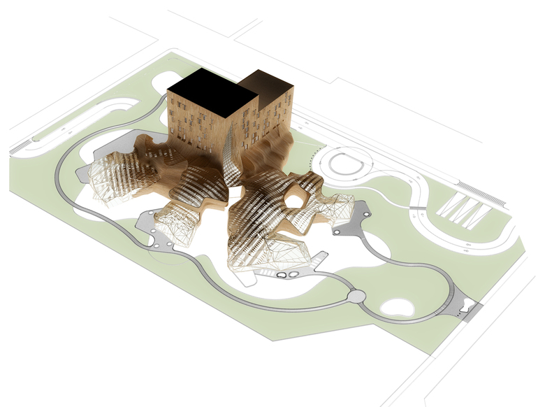 As we move away from the tower delicate curvatures lose fidelity. They become increasingly faceted and deprived of detail. Towards the edges of the site the hotel resolves into jagged polygonal forms of transparent glass that open up to the trees beyond as the journey continues into the horizon. The hotel disappears.