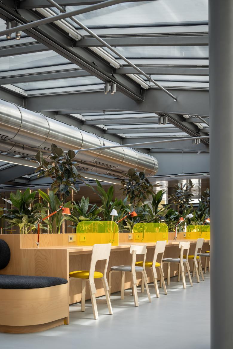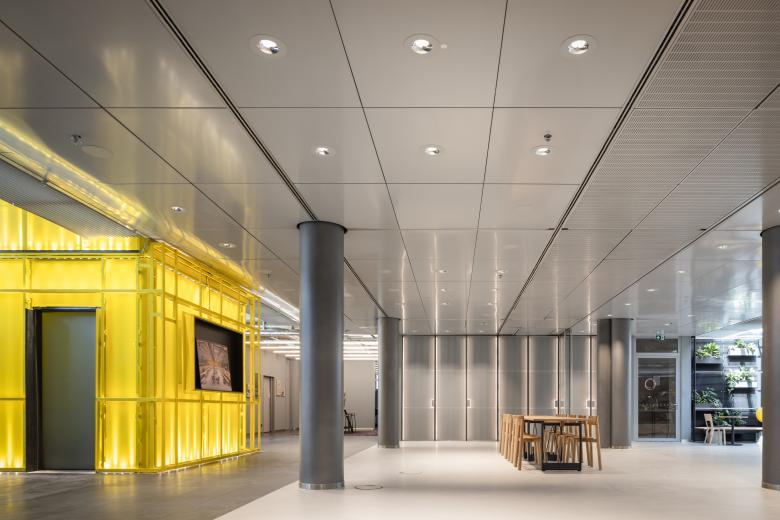 Zentrale Idee war, die Revitalisierung so ressourcenschonend zu gestalten und damit so viel Substanz wie möglich zu erhalten. Zunächst haben wir dafür ein Screening der vorhandenen Ausstattungen und Materialien vorgenommen und daraufhin kontrolliert zurückgebaut. So wurden etwa der bestehende Nadelvliesboden, einige Türen und die Hohlraumplatten wiederverwendet. Die abgehängten Decken wurden vollkommen entfernt, sodass die rohen, mit Haustechnik versehenen Betondecken zum Vorschein kommen und so belassen wurden, um eine loftartige, roughe Atmosphäre zu generieren. Wohnlich wirkende Möbel, abgepasste Teppiche und viel Grün innen wie außen vermitteln einen warmen, willkommenen Charakter. Darüber hinaus wurden weitestgehend natürliche und nachhaltige Materialien für die Innenräume verwendet. Für die Raumkühlung kommt das Gebäude mit der bestehenden Klimatisierung aus, geheizt wird per Fernwärme. Car- und Bike-Sharing sowie E-Ladestationen in den Tiefgaragen (1. und 2. UG) ergänzen das nachhaltige Service-Angebot von „LILO“.