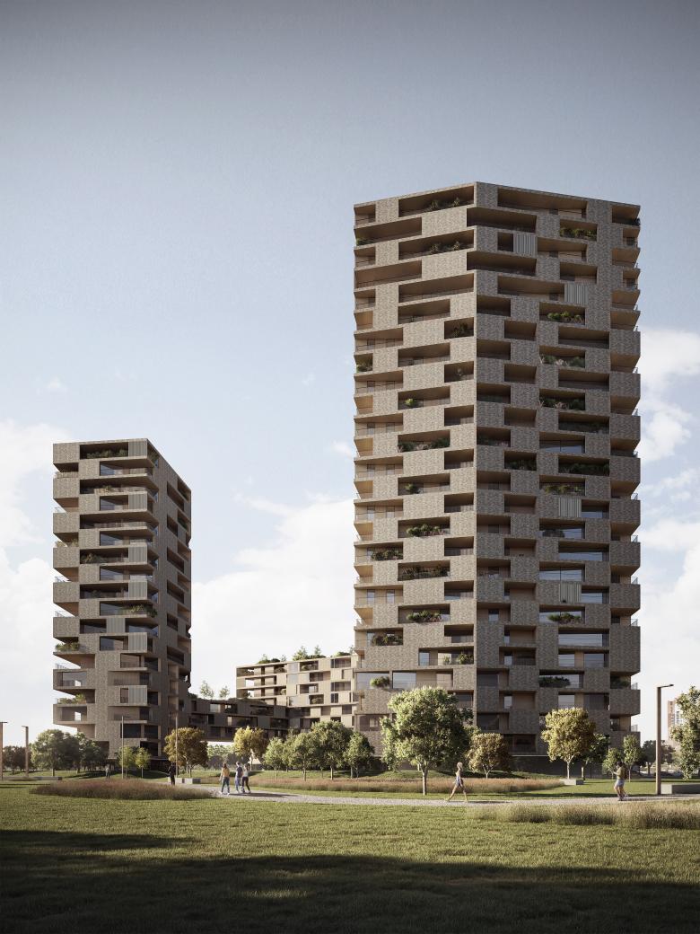 The volumetric layout, based on an “open hand” system, is six storeys high and ends with two vertical elements at the two vertices: a 26-storey, 88 m tower on the north side and an 18-storey, 62 m tower on the south side.