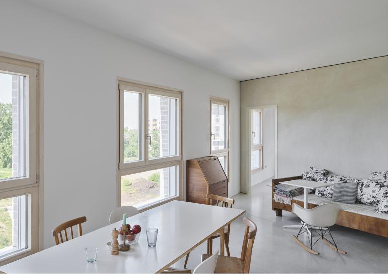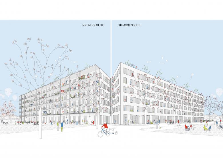 Direkt an der Freien Mitte, neben dem Schneewittchen-Hochhaus, entsteht der sogenannte Loft-Flügel, ein Projekt an der Schnittstelle zwischen Stadt- und Landschaftsraum. Der Loft-Flügel ist eine nutzungsoffene Struktur, in die sich unterschiedliche Raumanforderungen einschreiben können und in der die Grenzen von Wohnen und Arbeiten verschwimmen.