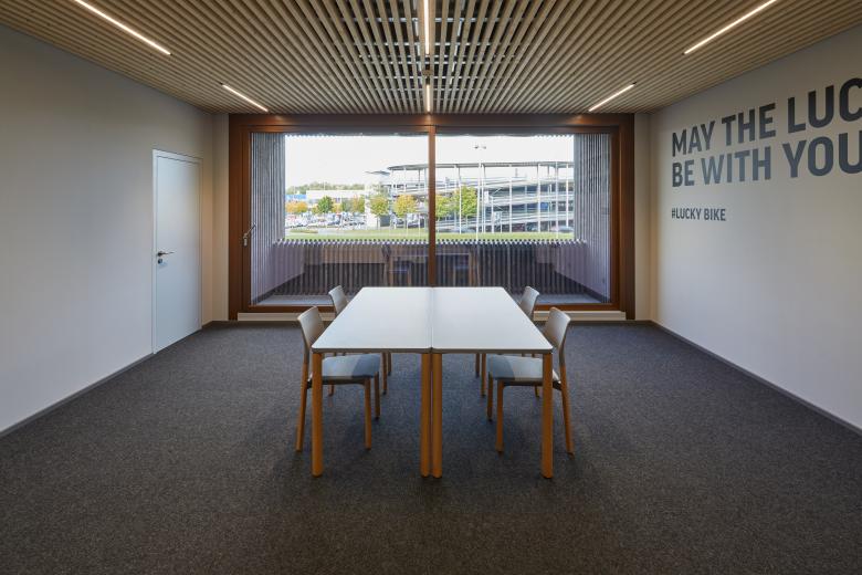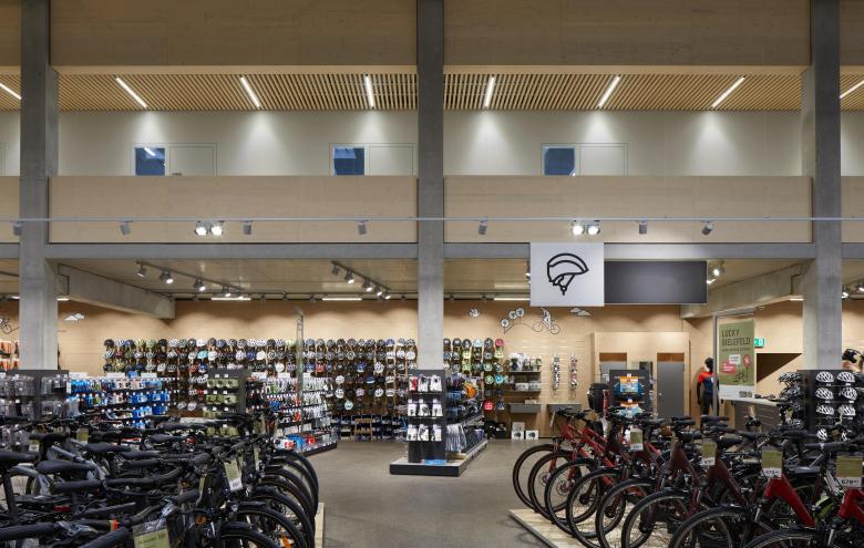 Zukünftig werden auf circa 2250 m² Fahrräder, Zubehör und Kleidung verkauft. Am hinteren Ende des Gebäudes befindet sich ein Lager über 3 Geschosse mit einer Gesamtfläche von knapp 1300 m², eine kleine Werkstatt mit Reparaturannahme sowie die erforderlichen Sozialräume. Zudem galt es, die zentrale Verwaltung mit ungefähr 50 Arbeitsplätzen im Gebäude unterzubringen. Diese liegen auf einer Galerieebene an der der Bundesstraße zugewandten Längsseite des Neubaus.
