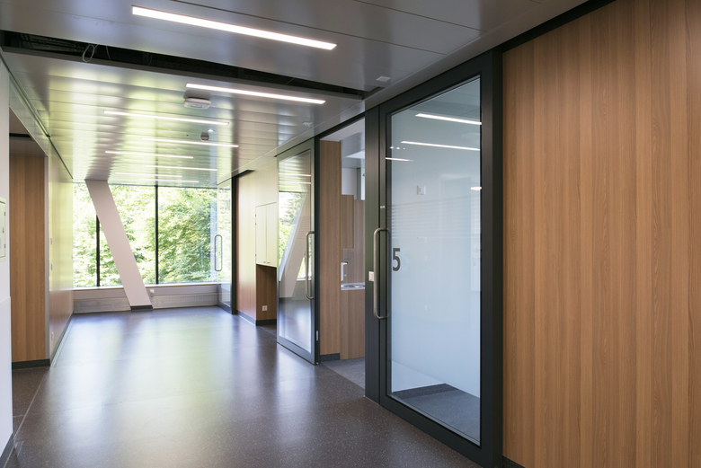 Das neue Zentrum für Notfall- und Intensivmedizin kommt voll zum Tragen. Von Anfang an musste Rechnung getragen werden, dass die Notfallzufahrt auch während des Baus in Betrieb blieb. Das viergeschossige Gebäude trägt es mit Fassung und stellt gleichzeitig sein Tragwerk zur Schau. Es trägt nicht dick auf, sondern verhüllt die Konstruktion hinter gläserner Horizontalität, die je nach Tageszeit, Wetter und Beleuchtung leicht spiegelt. Im Inneren war Flexibilität gefordert – die verschiedenen Nutzungen der Geschosse bedingten sehr unterschiedliche Grundrisse, bieten gleichzeitig Raum für modernste, lean-optimierte Spitaltechnik mit viel Übersicht und Aussicht für Patienten in schwierigen Situationen.