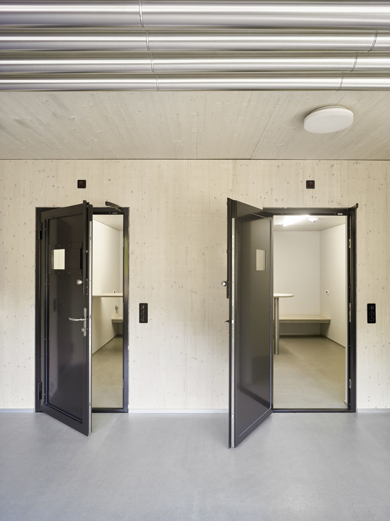 In der Bauprojekt- und Bewilligungsphase wurde der Entwurf weiter konkretisiert. An die überhohe Garage sind die Festhalteräume, Büros, der Aufenthaltsraum, sowie die Sanitär- und Technikräume so angegliedert, dass einerseits die sicherheitsbedingten Betriebsabläufe optimal ermöglicht werden und anderseits die Erschliessungsfläche auf ein Minimum reduziert werden konnte. Der eingeschossige Holzbau ist mit grossformatigen, hinterlüfteten Holzplatten verkleidet. Durch den schwarzen Anstrich der Fassadenplatten fügt sich der Bau in den unterschiedlichen Jahreszeiten optimal in die umliegende Landschaft ein und übernimmt die Farbgebung des Zollgebäudes auf Deutschem Hoheitsgebiet. Im Innern sind die Fichtenoberflächen und sämtliche Installationen sichtbar belassen, was den Räumen den rohen Charakter eines Werkgebäudes verleiht. Ein geschliffener Anhydritboden leistet die notwendige Wiederstandsfähigkeit für das sehr unterschiedlich, aber ganzjährig frequentierte Gebäude.
