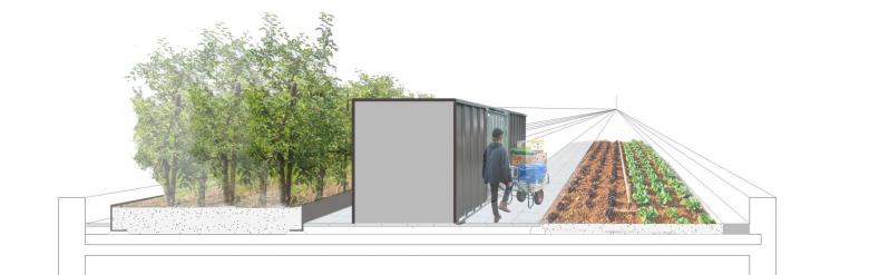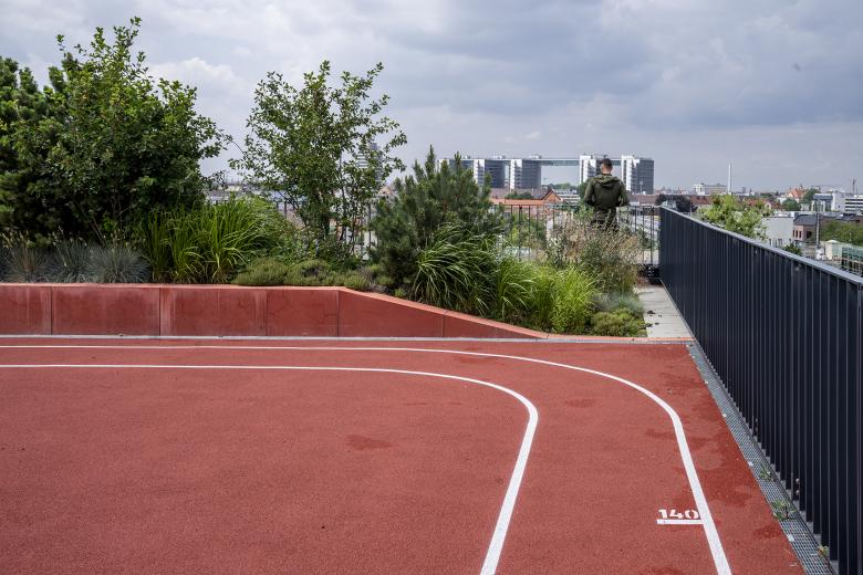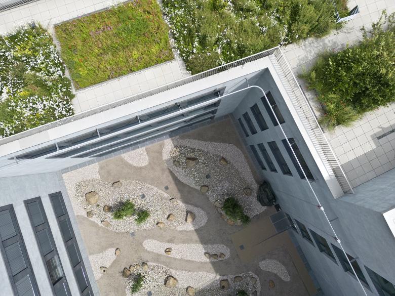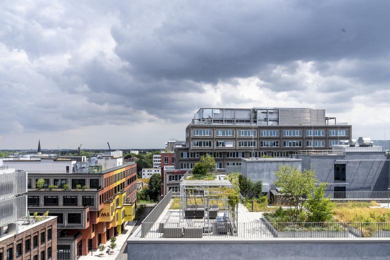 Eine lebendige, vielseitig nutzbare und intensiv begrünte Dachlandschaft ergänzt die Freiflächen. Mit Sportangeboten, Aussichtsterrassen, Urban Gardening Flächen und Außenarbeitsbereichen spiegeln die Dachflächen der Macherei das breite Bedürfnis nach unterschiedlichen Aufenthalts- und Betätigungsangeboten in der modernen Arbeitswelt wieder.
