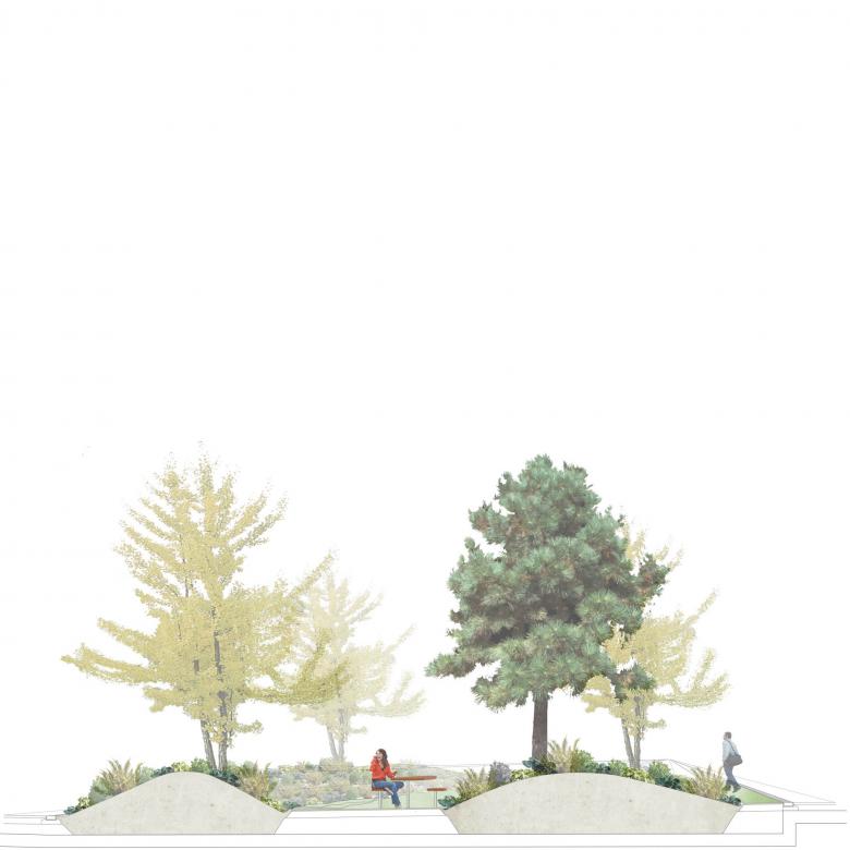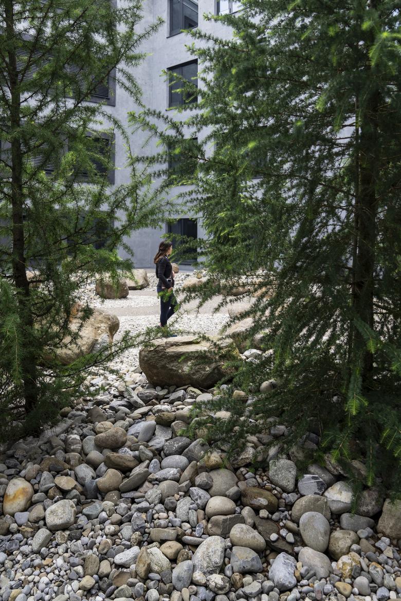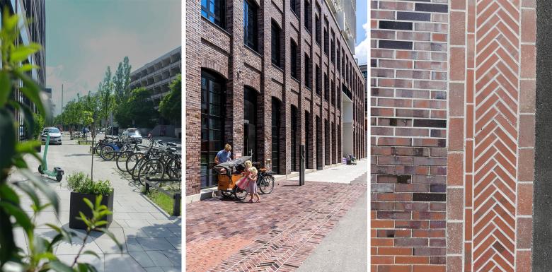 Unterschiedlichen Erdgeschossnutzungen und Raumtypologien werden verschiedene Materialien zugeordnet. Vorzonen an den Gebäuden gliedern die Freiräume der Macherei. Die großen, kompakten Baukörper stehen wie auf Teppichen im Quartier. Die Strukturvielfalt in der Belagsebene schafft unterschiedliche Freiraum-Atmosphären und auf der Bodenebene einen Bezugspunkt im menschlichen Maßstab. In der Belagsvielfalt entstehen zusätzliche Aufenthaltsräumen mit spezifischer Atmosphäre.